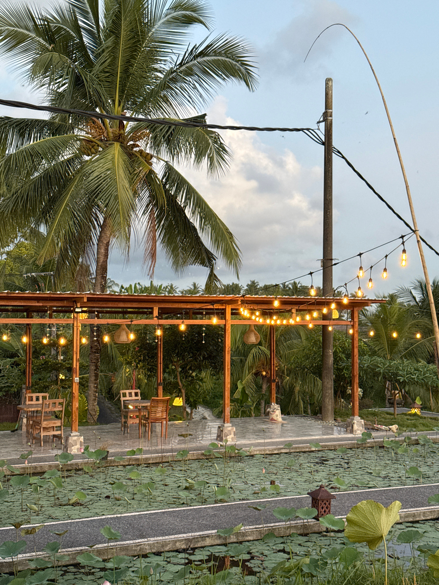 The image captures an outdoor tropical setting, likely a cafe or restaurant, at dusk or early evening in Ubud District, Indonesia. The scene is rich with lush green vegetation, featuring prominent pal…read more