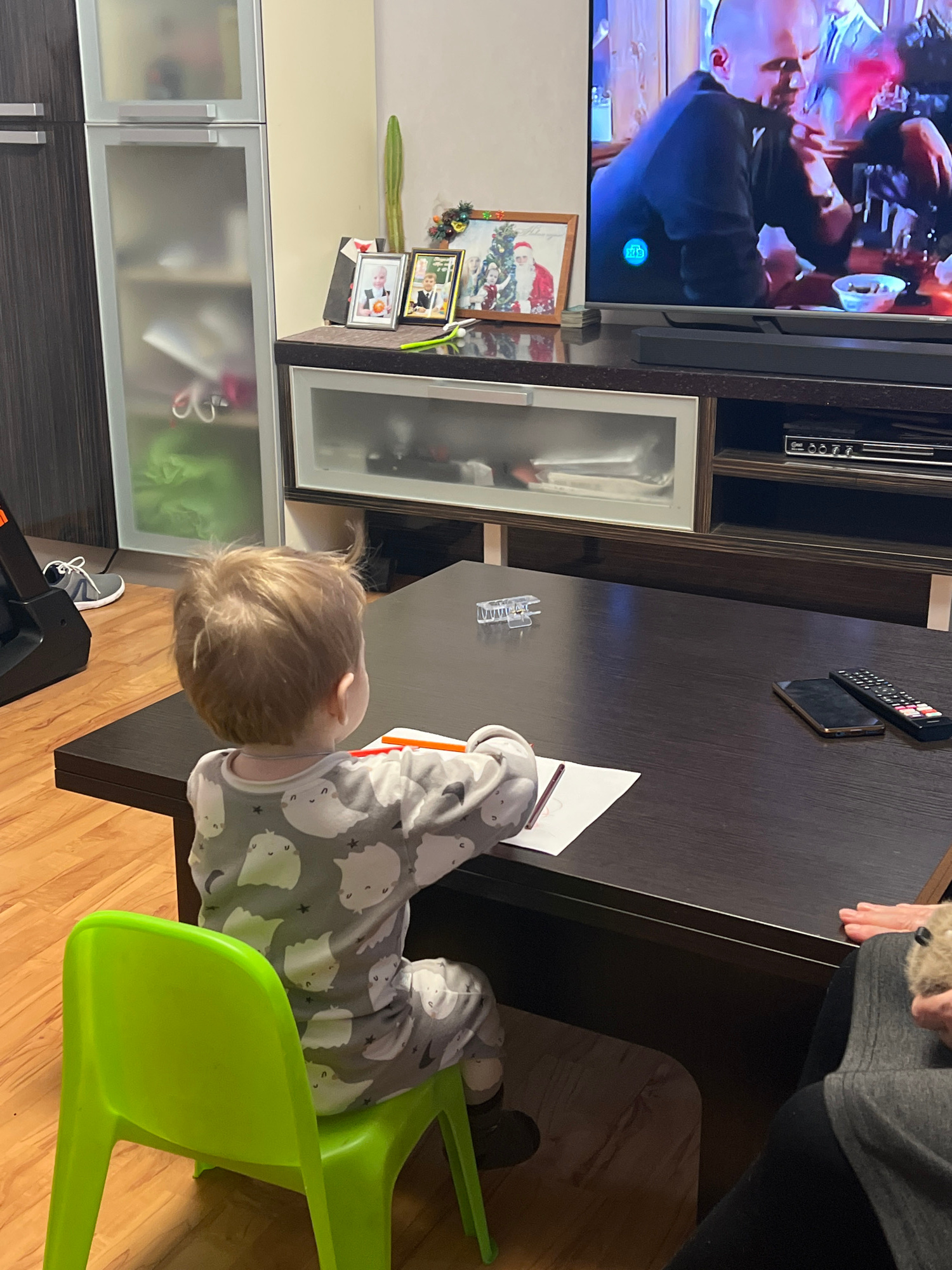 This image captures a domestic indoor scene, likely a living room or dining area, with a young child and an adult present. The perspective is from slightly above, looking down at a dark brown rectangu…read more
