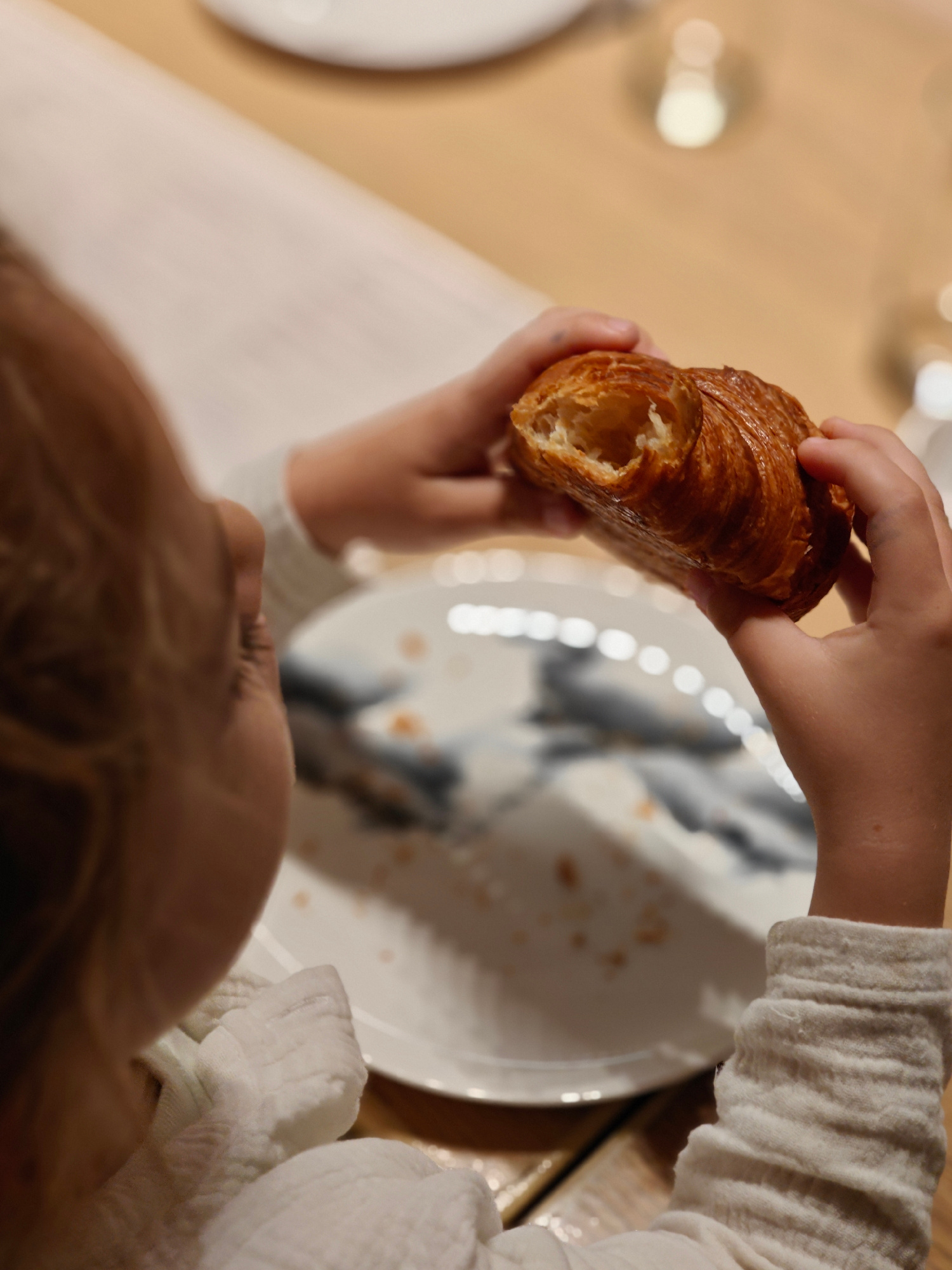 A child is holding a croissant over a plate. The child is wearing a white, long-sleeved shirt. The plate has a blue and white design with croissant crumbs on it. The setting appears to be an indoor diβ¦read more