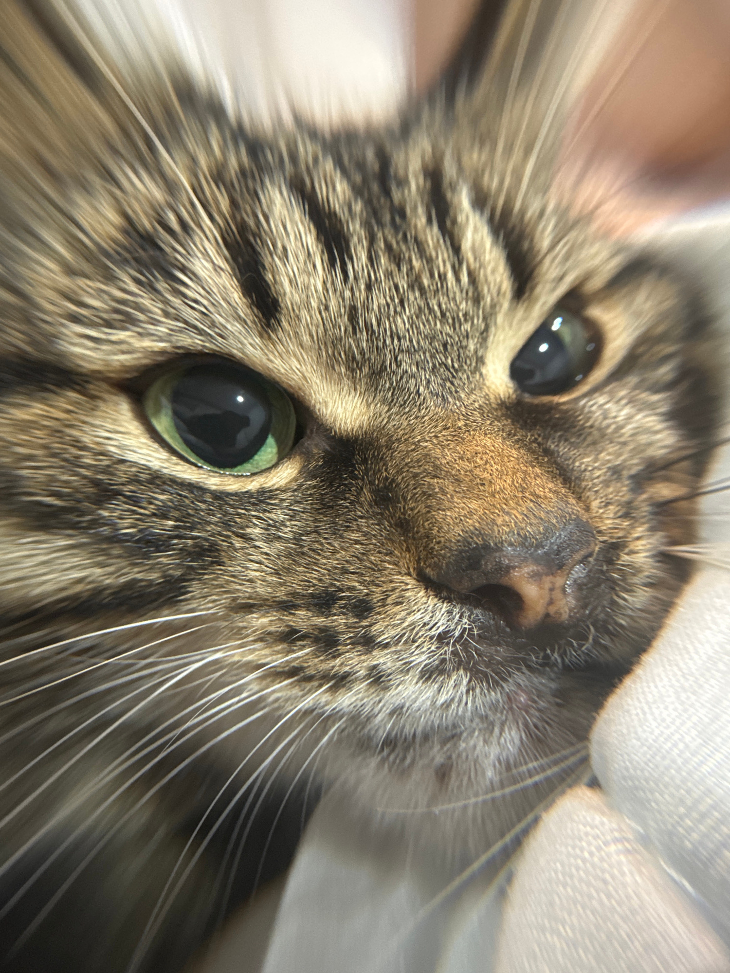 A close-up, slightly blurred image focuses on the face of a brown tabby cat with green eyes. The cat's nose is centered in the frame, with the eyes positioned on either side. White whiskers are visibl…read more