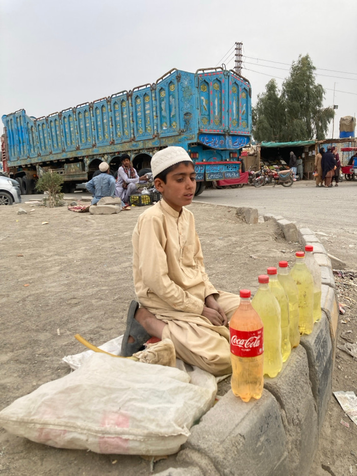 The image depicts a roadside scene in Taftan, Pakistan, characterized by commercial activity and transportation infrastructure under an overcast sky. In the foreground, a young male, appearing to be…read more