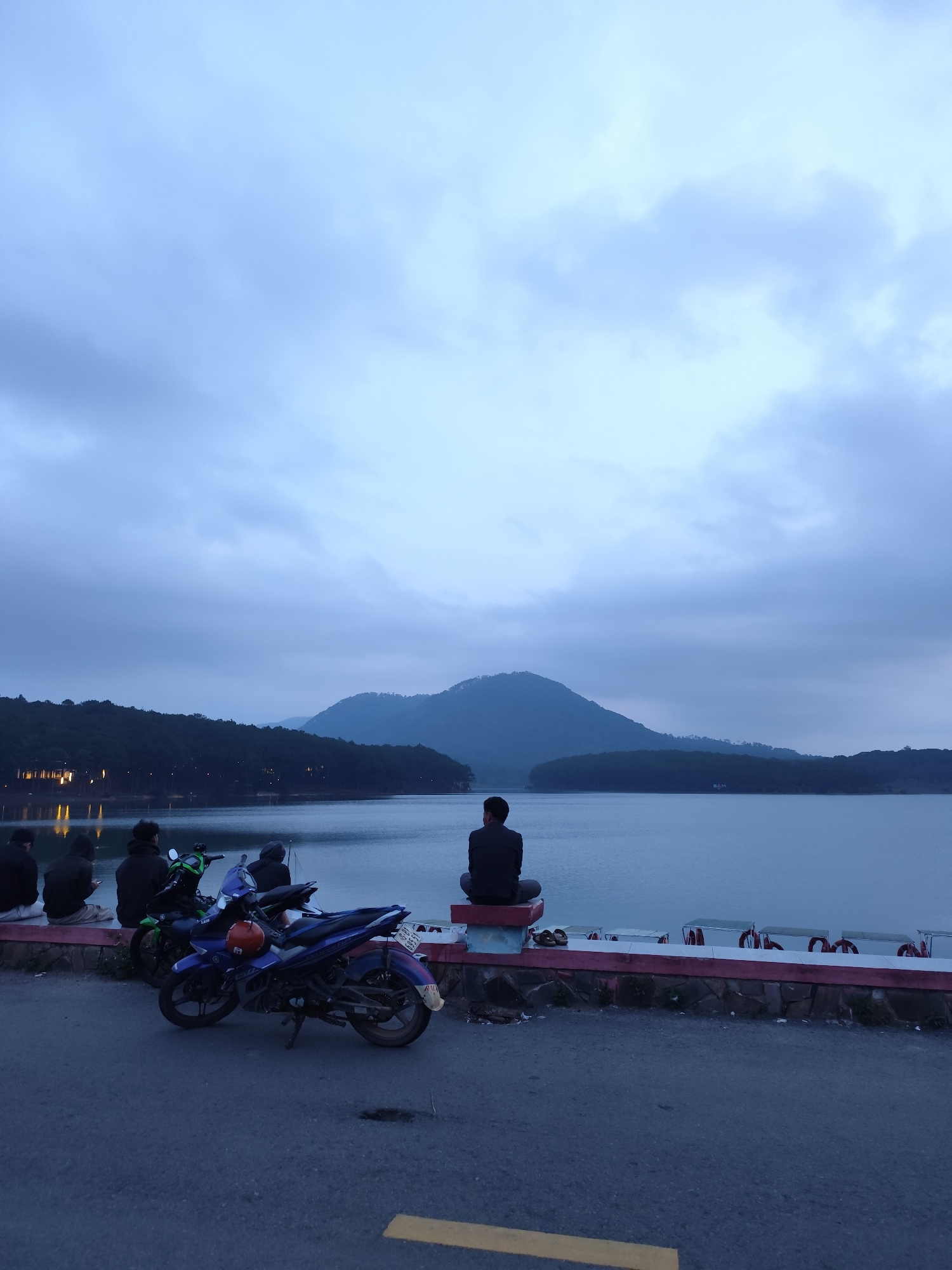 The image shows a view of Xuan Huong Lake in Da Lat, Vietnam, under a cloudy sky. In the foreground, there's a road with a yellow painted stripe and two motorcycles parked along the side. People are s…read more