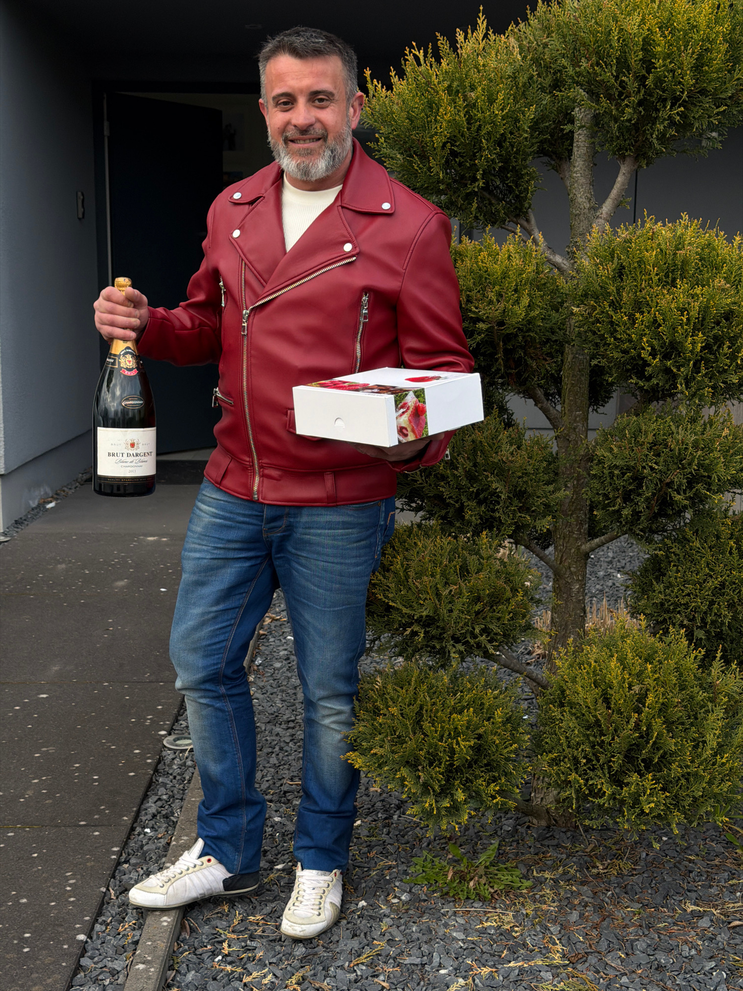 A male subject stands outdoors in Junglinster, Luxembourg, facing forward and smiling. He possesses a salt-and-pepper beard and short hair. He is wearing a red leather jacket with prominent zippers, a…read more