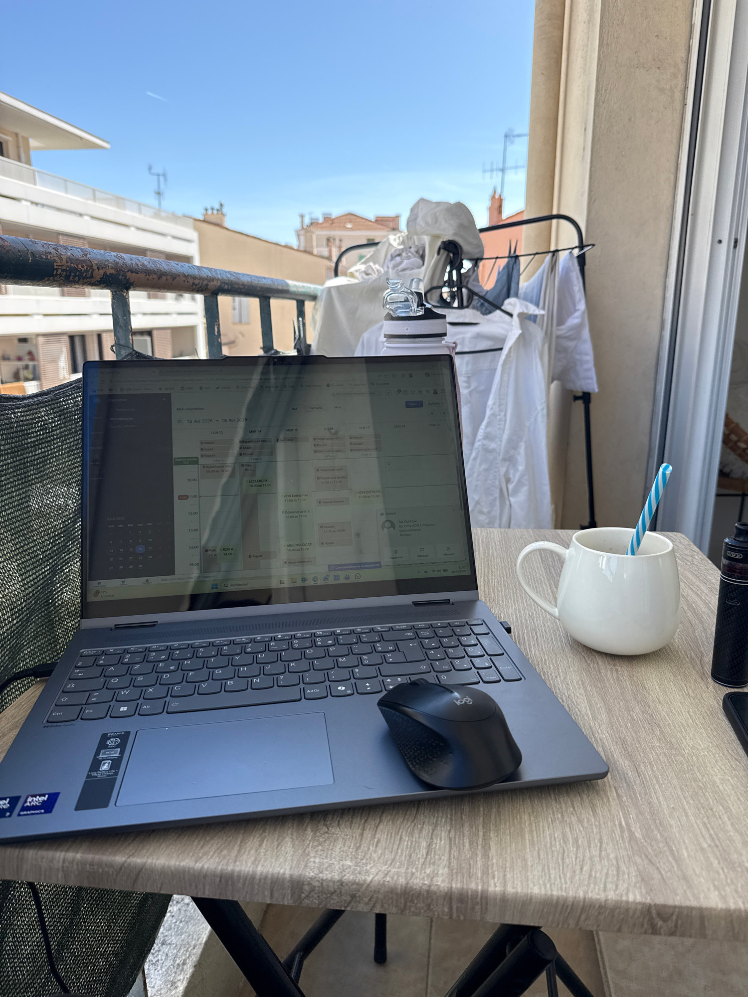 The image shows a laptop computer with a wireless mouse on a wooden table or desk. A white mug with a blue and white striped straw is next to the laptop. A cylindrical object is visible above the mug.…read more