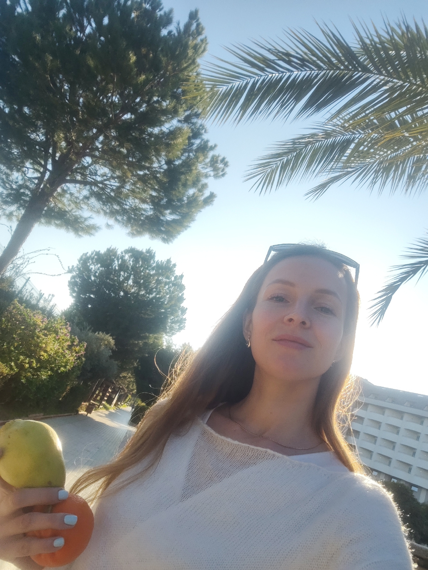 The image displays a bright, low-angle outdoor selfie of a single female individual. The woman, positioned in the foreground, has long brown hair, with sunglasses resting atop her head, and is wearing…read more