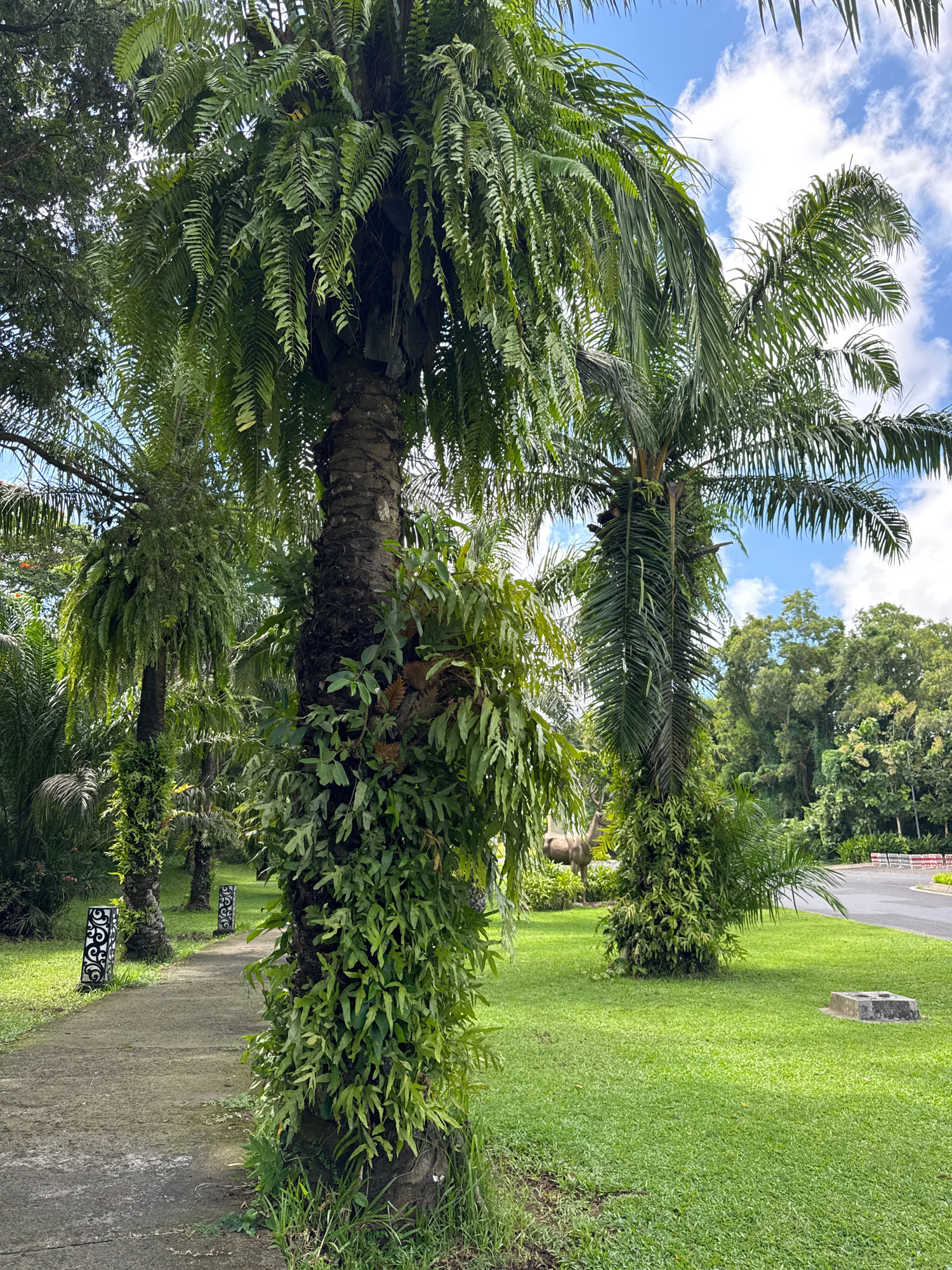The image depicts a row of palm trees alongside a paved walkway in a grassy area. The location is Unknown, Unknown. The palm trees vary in size and some have ferns growing on their trunks. The walkway…read more