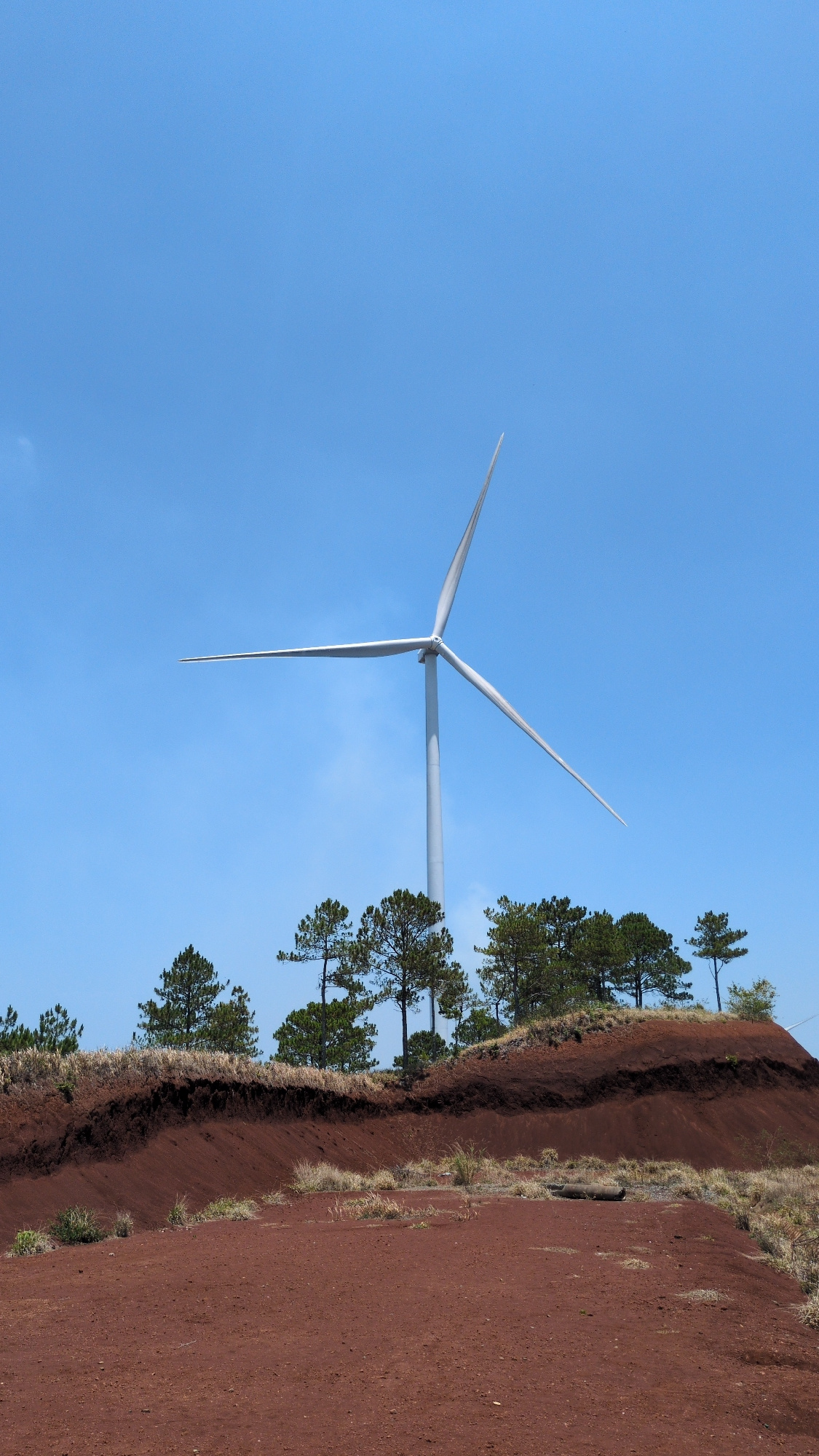 The image shows a wind turbine set against a clear blue sky. The foreground features a red dirt embankment with sparse vegetation and trees. The location, Phát Chi, Vietnam, is not apparent from the v…read more