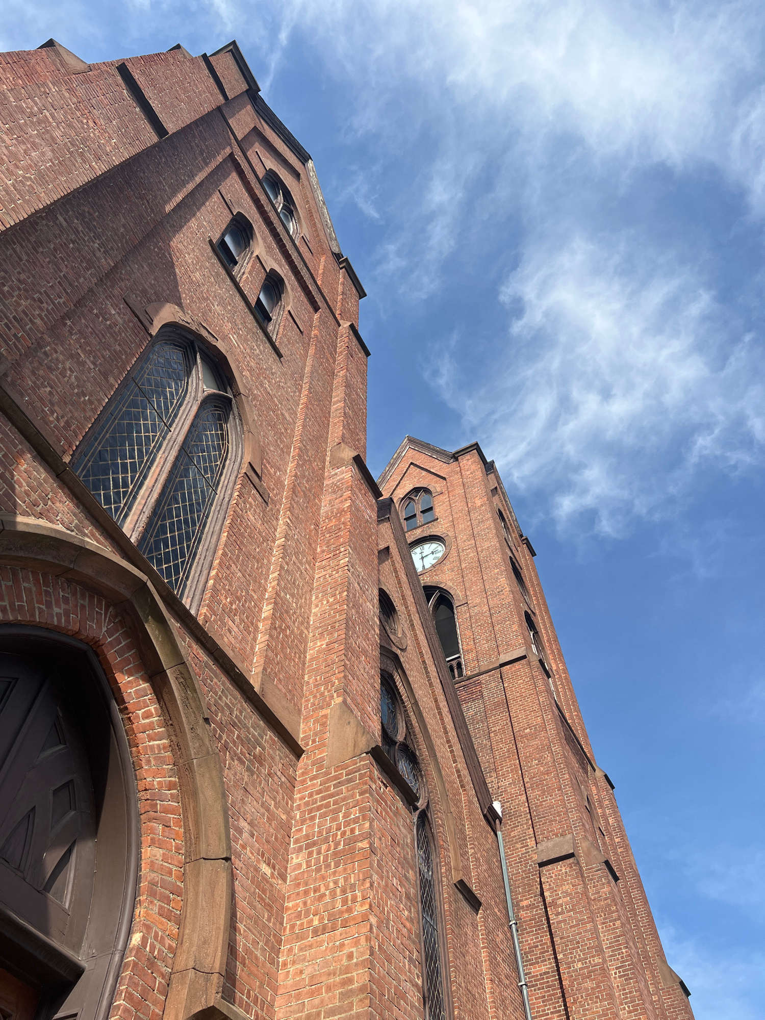 A low-angle shot captures a brick building with a sky backdrop in City of Newburgh, United States of America. The structure is constructed of orange-red bricks. A large arched window is situated above…read more