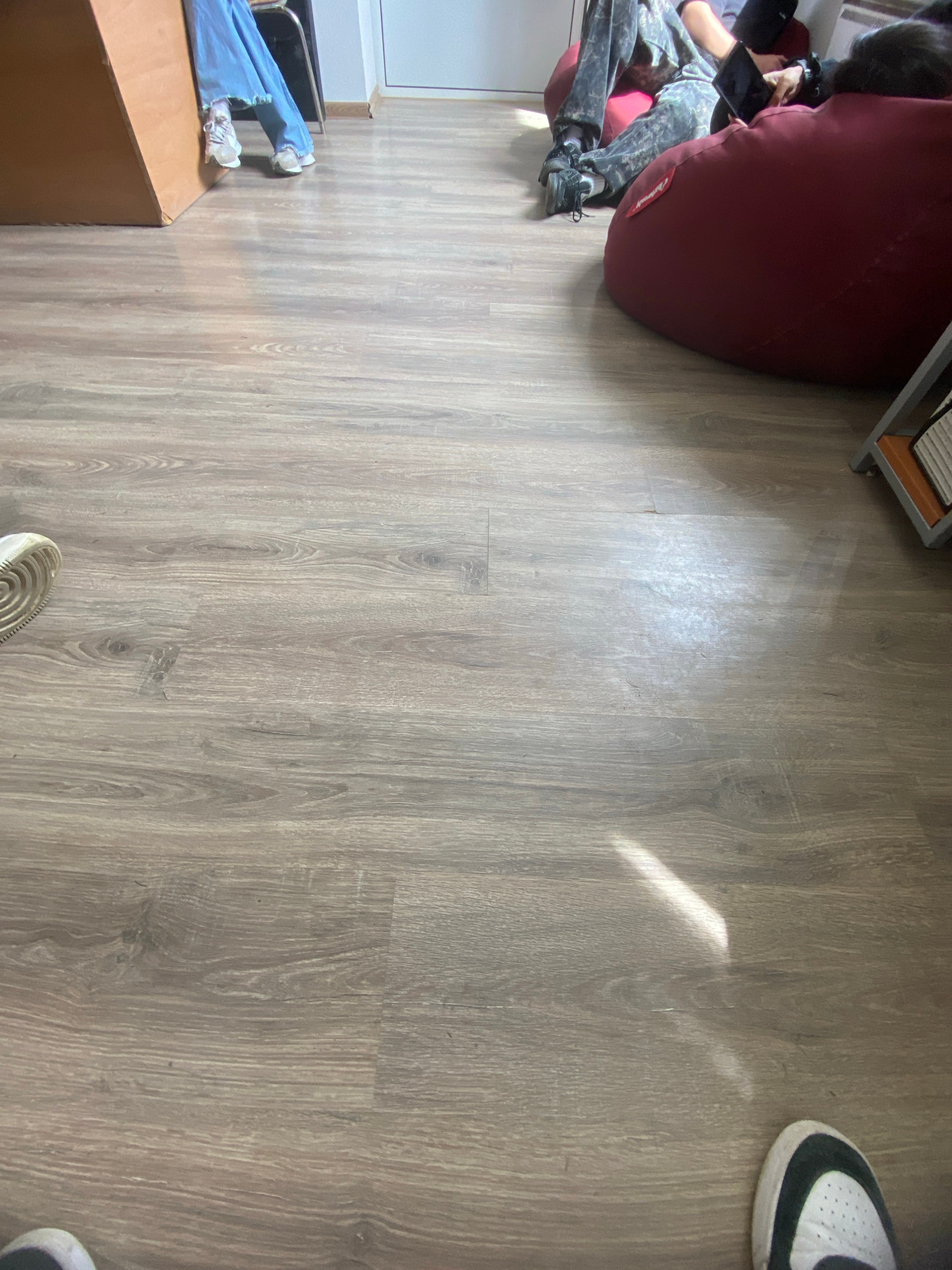 The image shows an indoor scene on a wooden floor. A person is sitting on a large red beanbag chair, holding a phone. Another person is lying on the floor near a desk, wearing jeans and white sneakers…read more