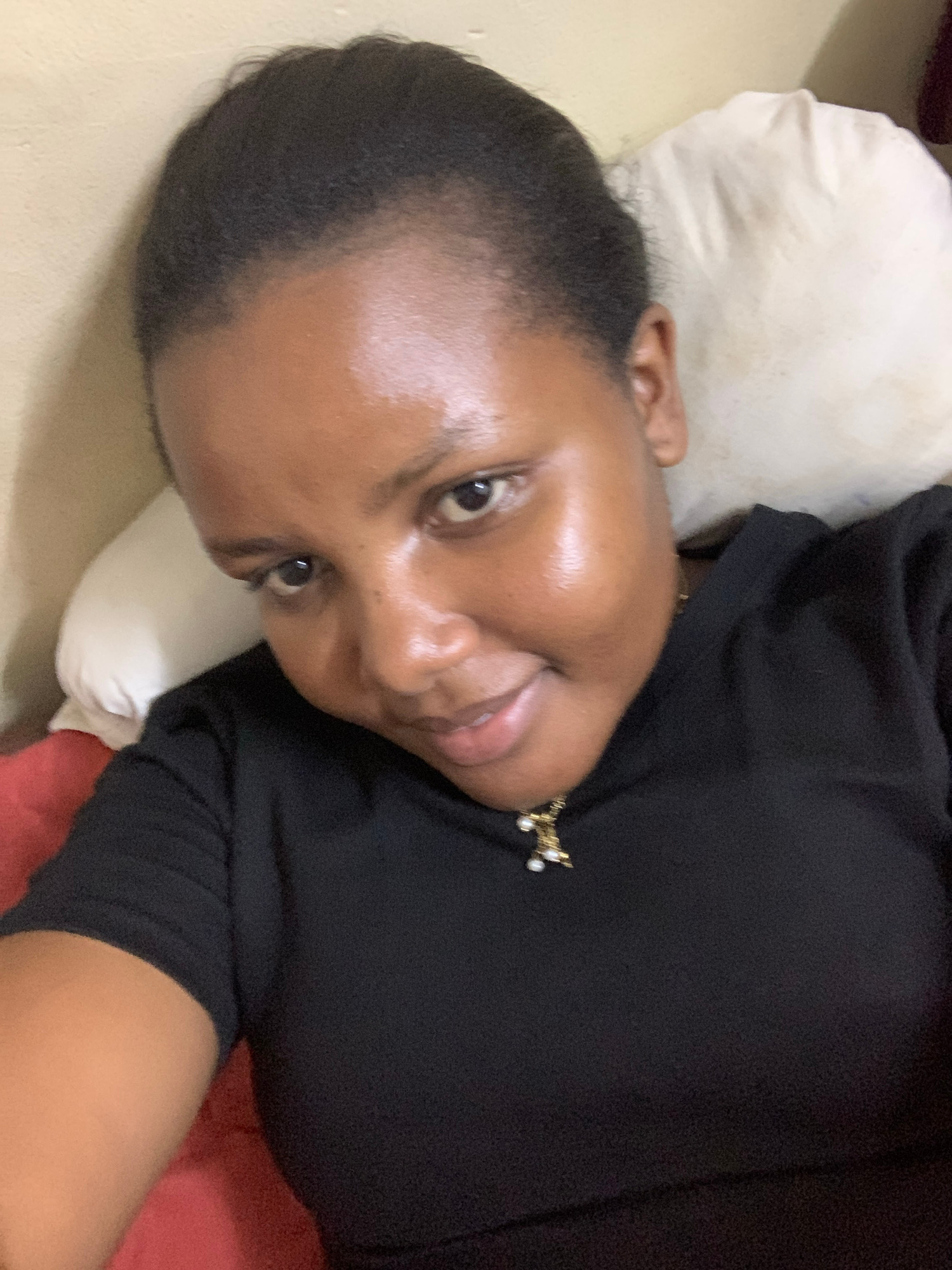 A medium, high-angle, indoor shot features a person reclining against a white pillow. The person has dark hair, smooth, dark skin, and is wearing a black garment. A small, gold necklace with pearl acc…read more