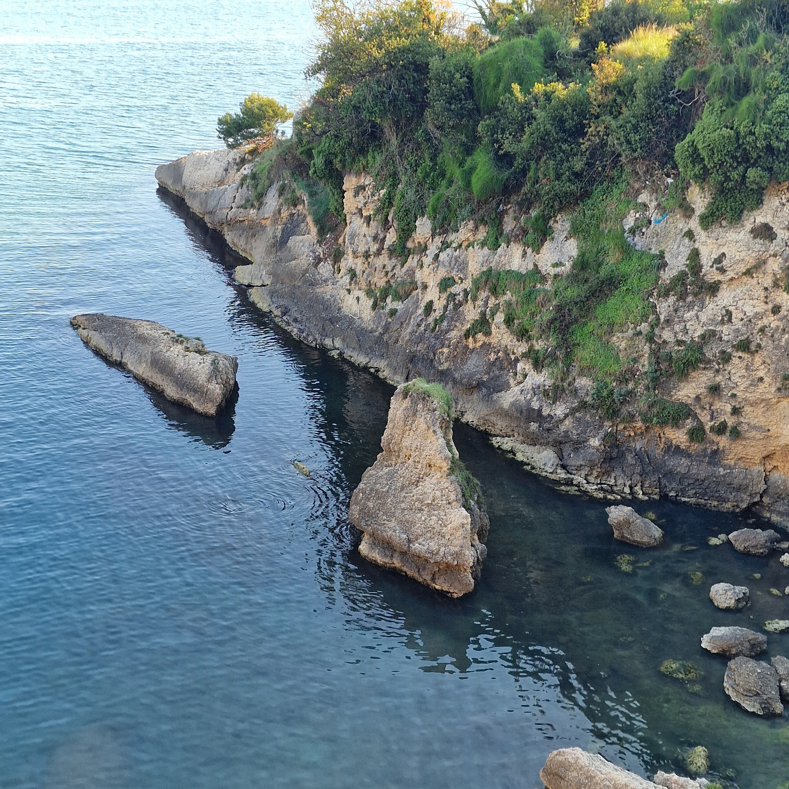 The image shows an aerial view of the coast in Ulcinj - Ulqin, Montenegro. A rocky promontory covered in vegetation extends into the blue water. Smaller rock formations are visible both on the coast a…read more