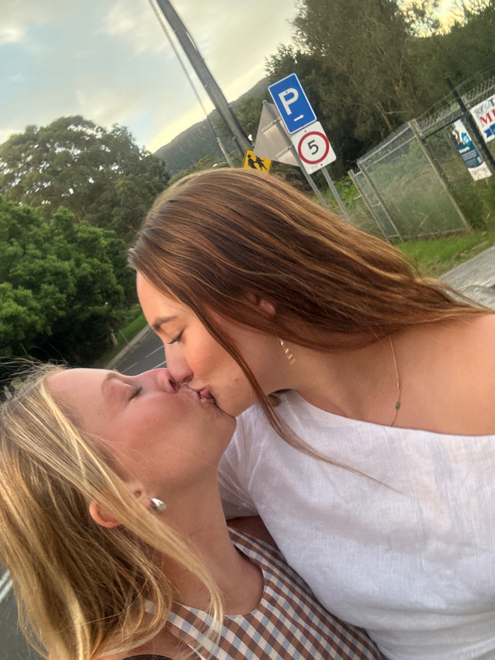 Two young women are depicted in an outdoor, head-and-shoulders profile shot, kissing with their eyes closed. The woman on the left, with blonde hair, wears a brown and white checkered top and a silver…read more