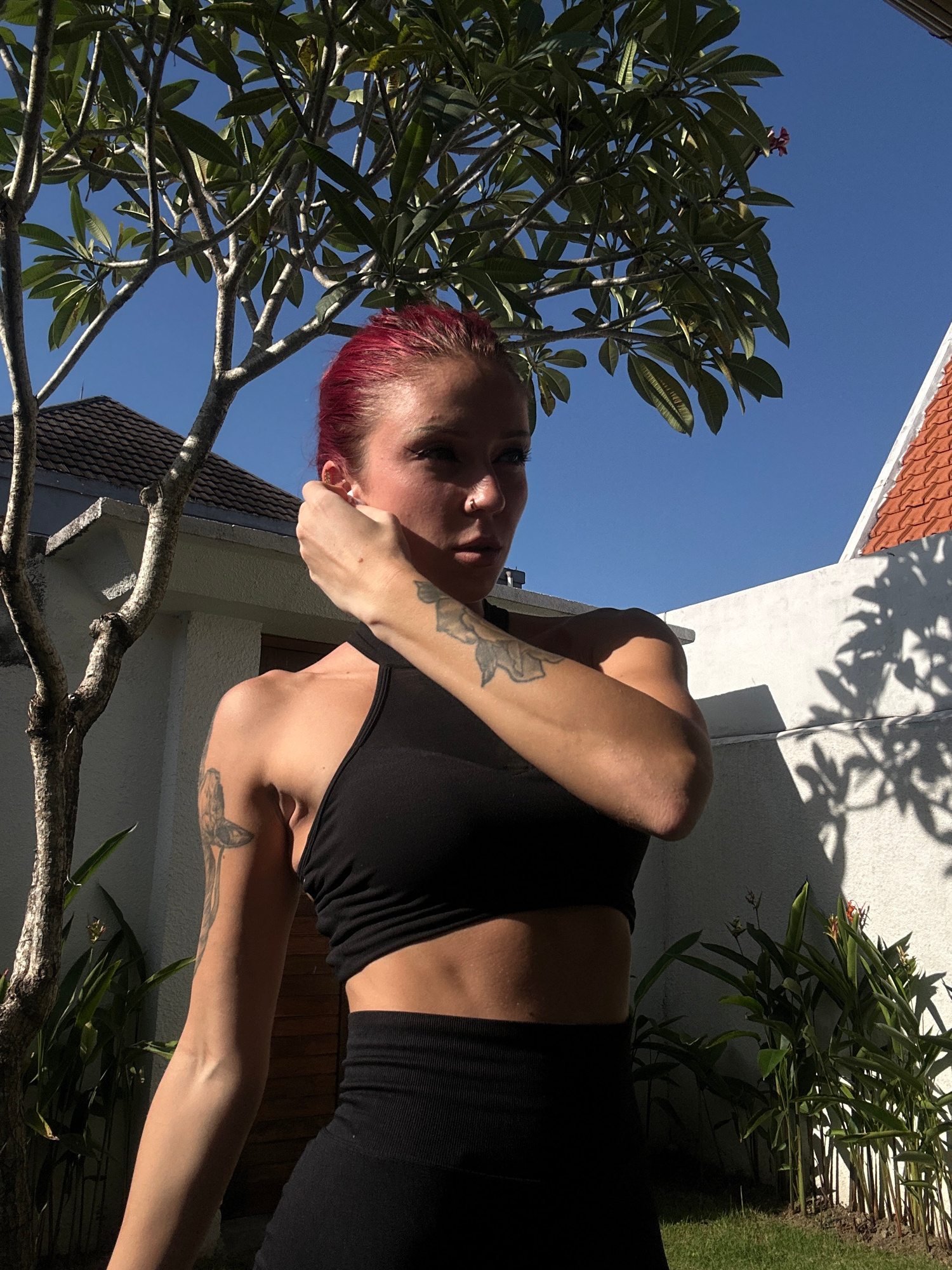 A medium-shot depicts a woman in athletic wear, seemingly posing outdoors. The woman has reddish-pink hair and tattoos on her arms. She is wearing a black sports bra and matching bottoms. A tree with…read more