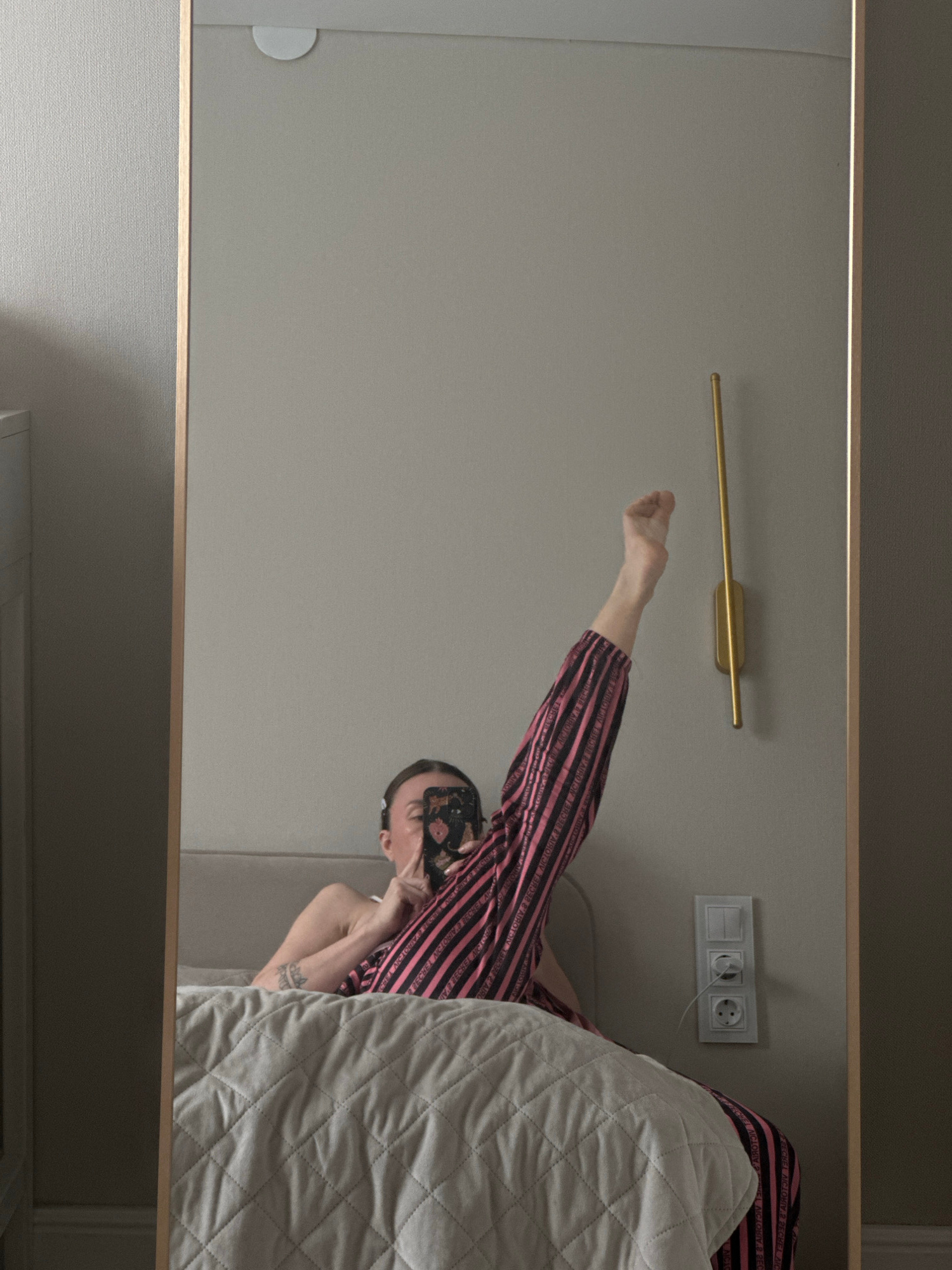 A person is reflected in a large rectangular mirror with a thin gold frame. The person is wearing pink and black striped pajamas and holding a phone with a floral case in front of their face. Their le…read more