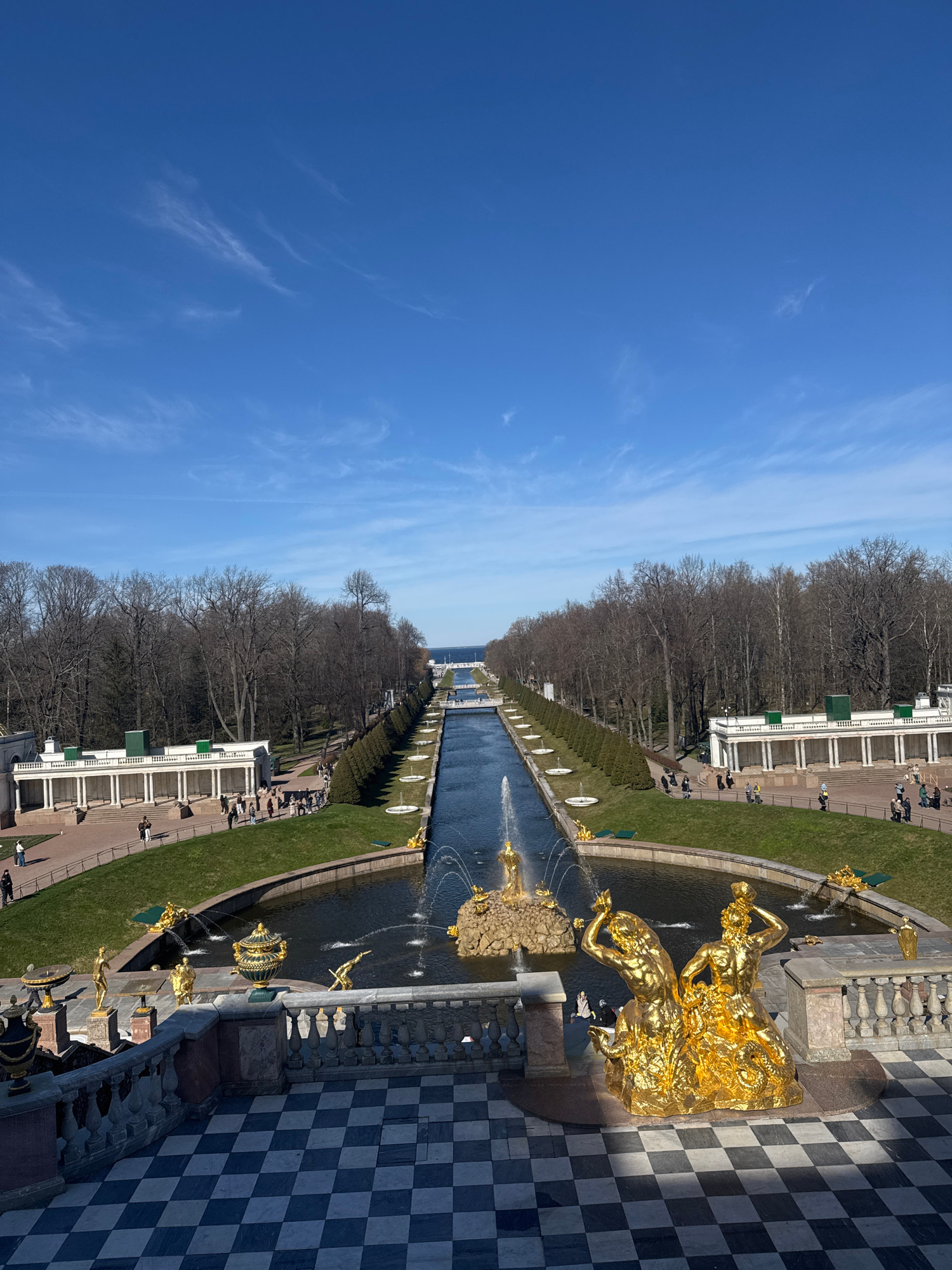 This image captures a panoramic view of the Grand Cascade and Grand Canal at Peterhof, Russia. Taken from an elevated position near the Grand Palace, the perspective looks down the long canal towards…read more