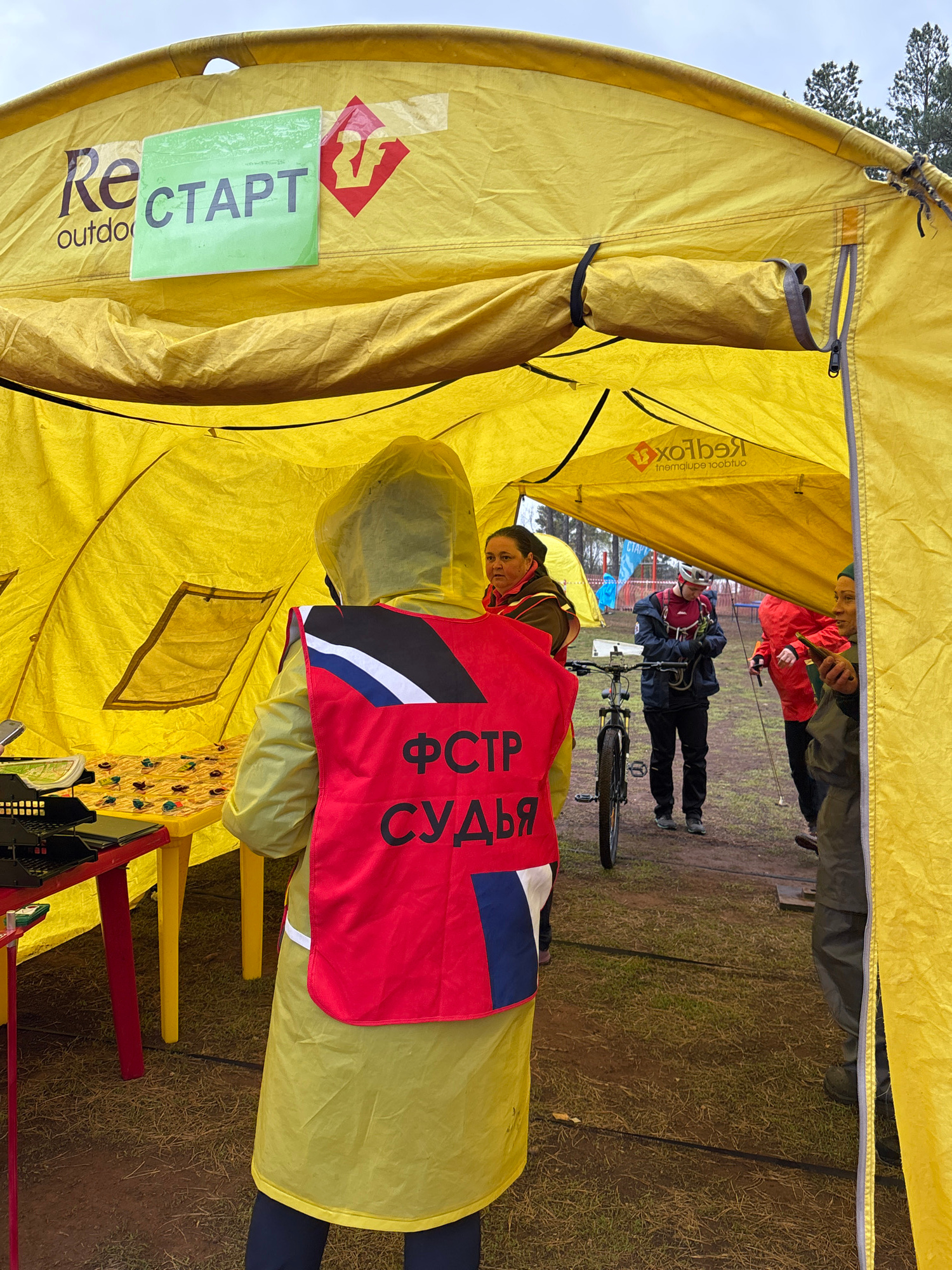 A yellow tent is set up in an outdoor setting, possibly in the city of Orenburg, Russia, based on the lettering on a red vest worn by an individual. The tent is marked with the word "СТАРТ" (START) an…read more