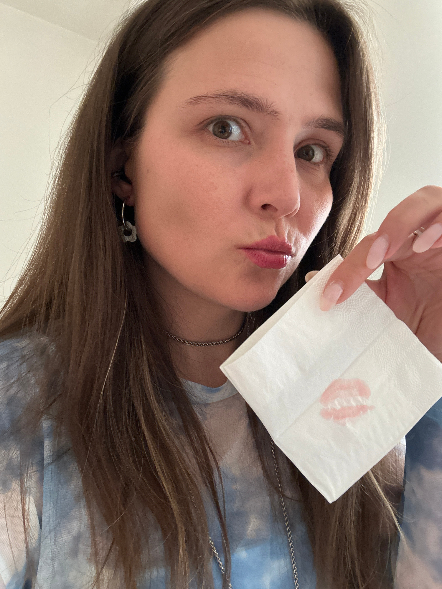 A woman is holding a white napkin with a lipstick print on it. The background shows the color of a light blue tie-dye shirt. The image appears to have been taken indoors. There is no evidence to sugge…read more