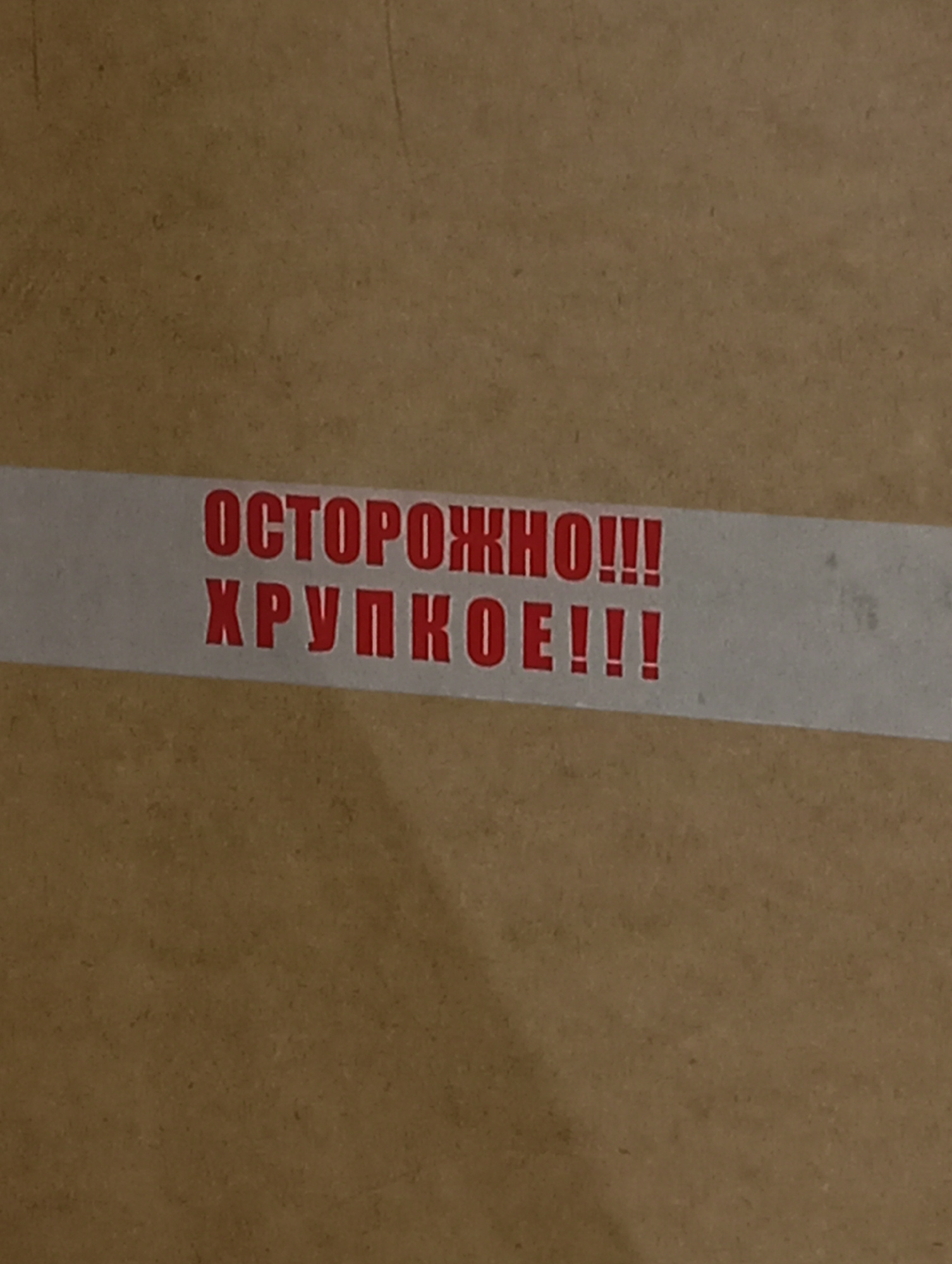 A close-up shot captures a section of a cardboard box, marked with a white packing tape. Printed on the tape in red, Cyrillic letters are the words "ОСТОРОЖНО!!!" and "ХРУПКОЕ!!!", which translate to…read more