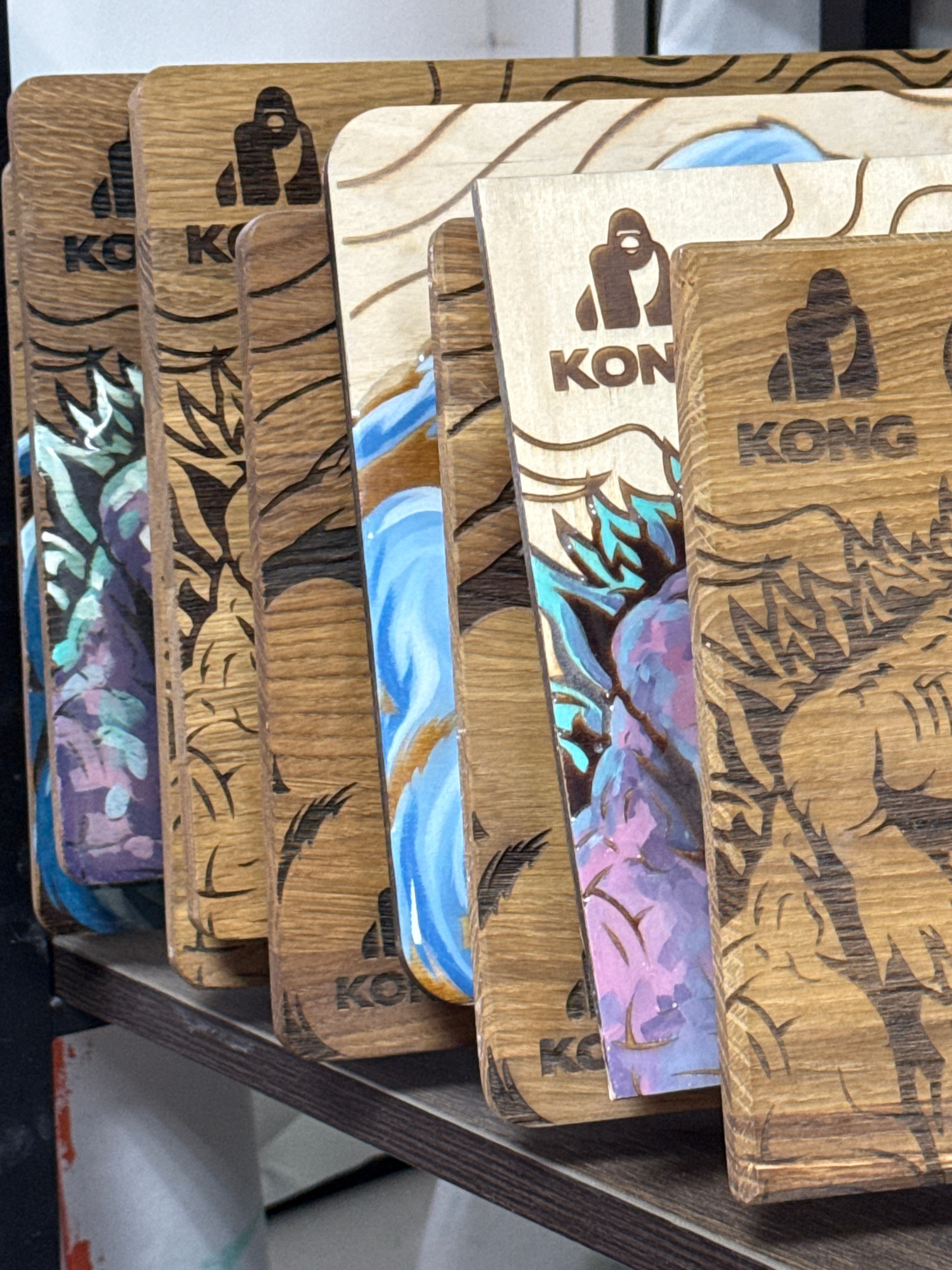 A stack of wooden items, possibly coasters or small plaques, rests inside a dark-colored wooden tray. The items are printed with the word "KONG" and images of what appear to be cartoon apes and leaves…read more