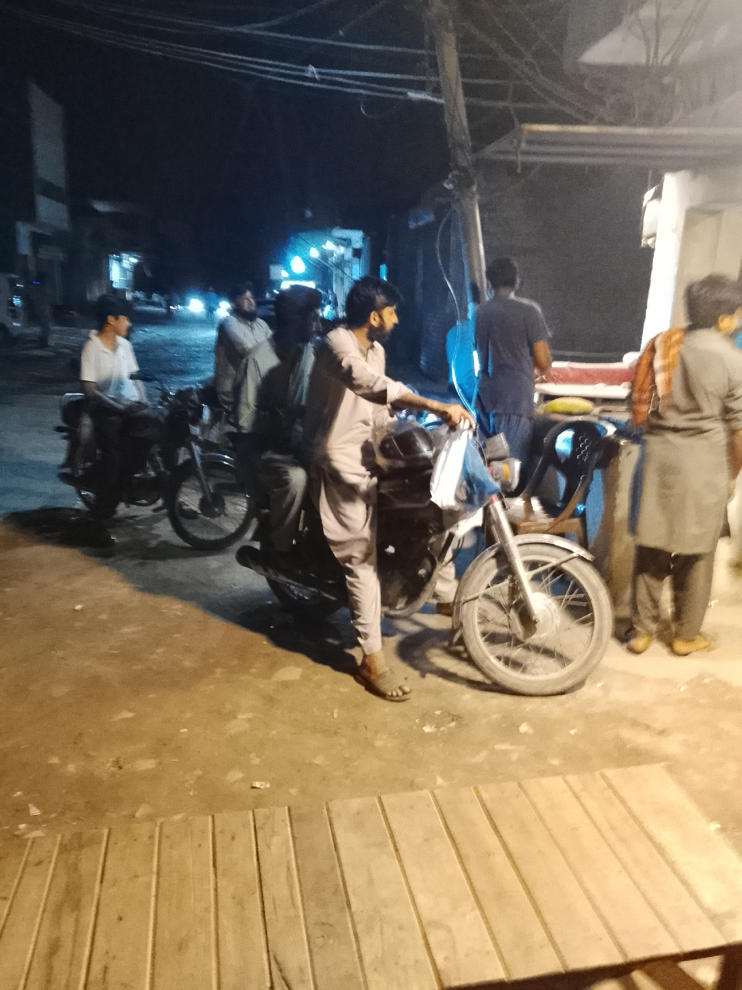 This nighttime scene captures a street or roadside gathering in Multan, Pakistan, illuminated by artificial light sources. The dimly lit environment suggests it is late evening or night. The primary…read more