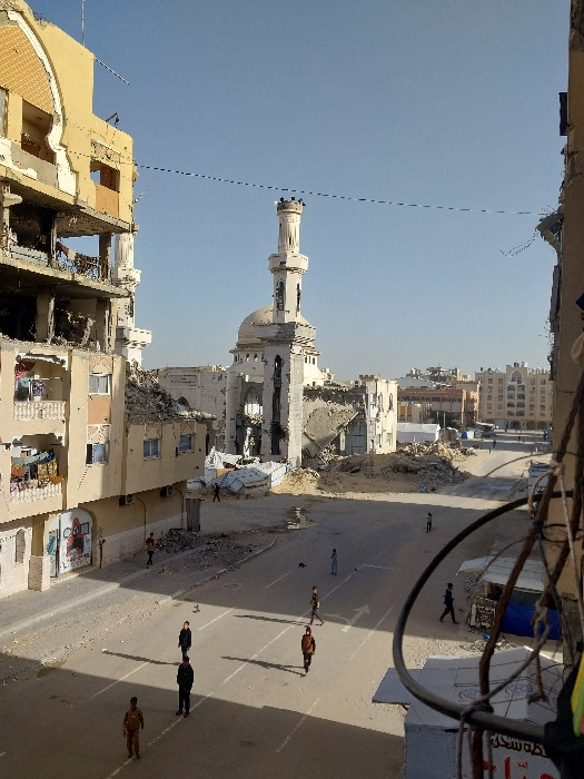 This image captures a wide-angle view of a severely damaged urban street in Khan Yunis, Palestinian Territory, under a clear blue sky. In the background, a prominent mosque featuring a light-colored d…read more