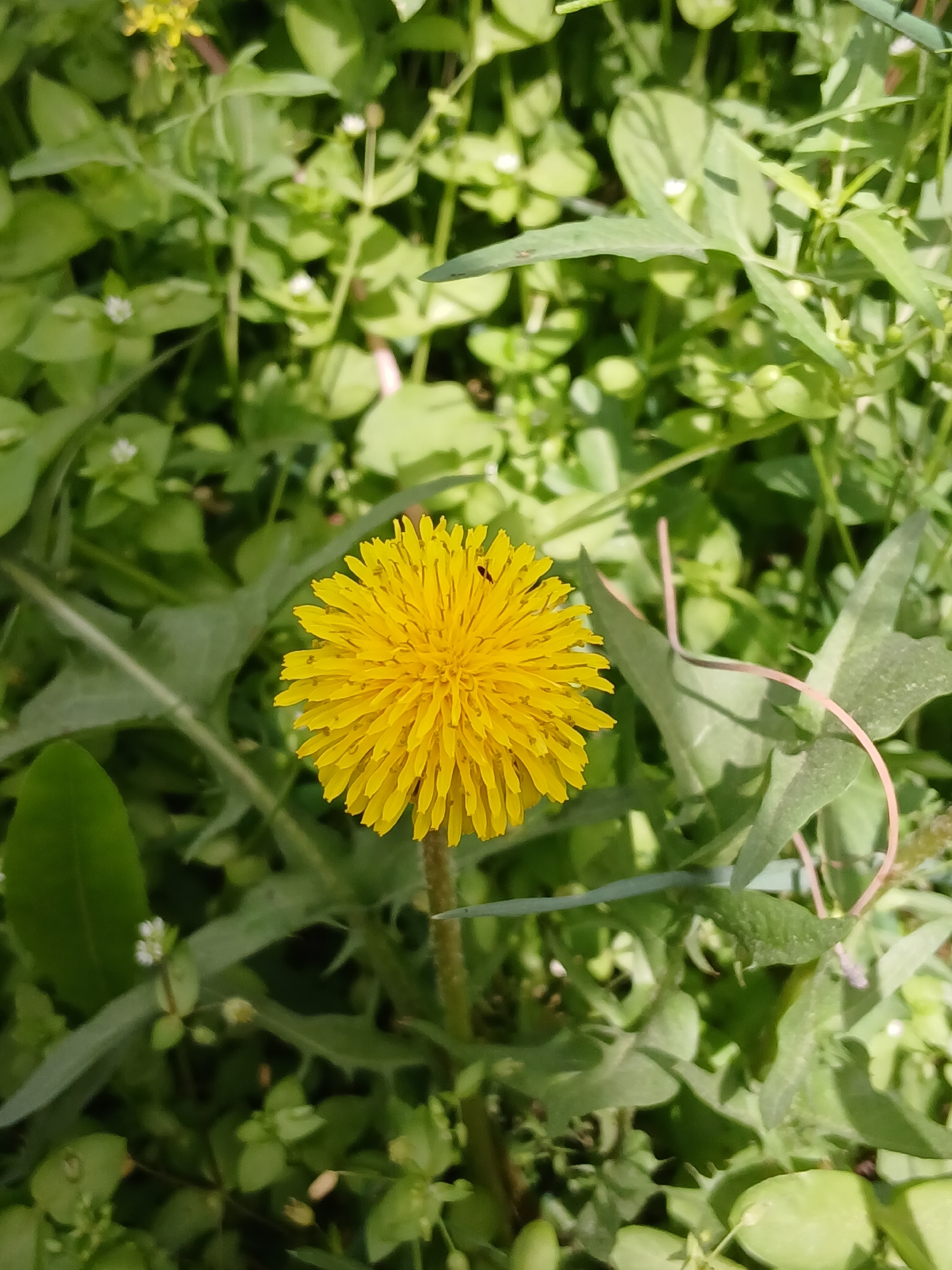 The image shows a bright yellow dandelion flower in the center of the frame. It is surrounded by various green plants, including dandelions, clover, and other low-lying vegetation. The scene appears t…read more