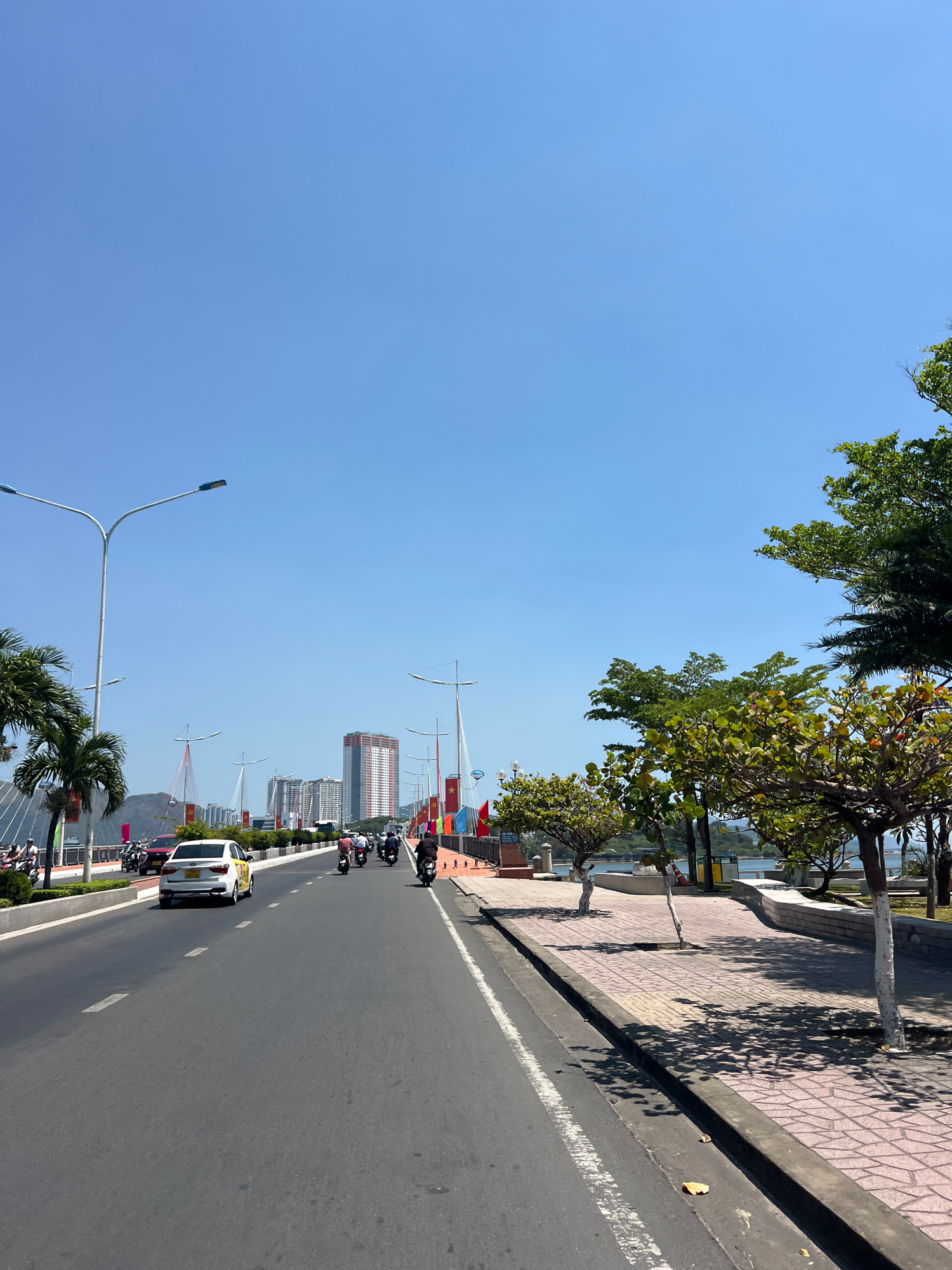 The image shows a street scene in Nha Trang, Vietnam. The photograph is taken from street level looking down a long avenue, perpendicular to the sidewalks on either side of the road. On the left side…read more
