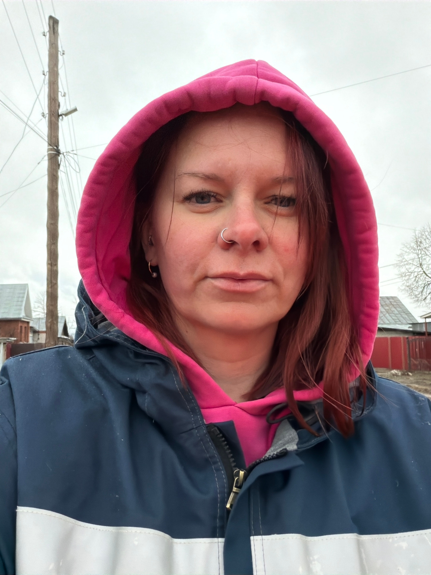 The image shows a woman in a pink hooded sweatshirt underneath a dark blue jacket with white reflective stripes. She has red hair, a nose ring, and an earring. The background suggests an overcast day,…read more