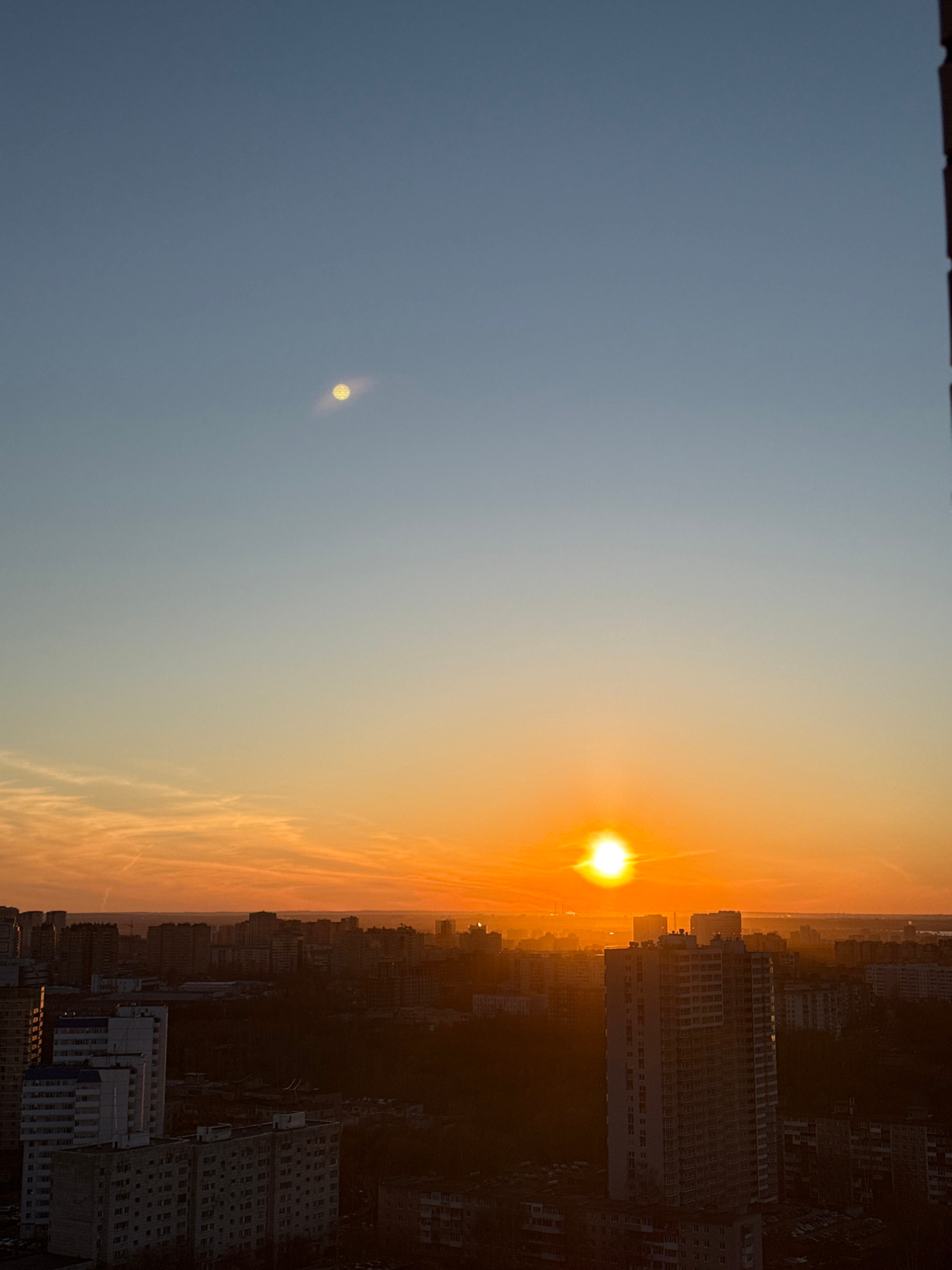 Here's a description of the image: The image shows a sunrise over Perm, Russia. The sky transitions from a pale blue on the left to a bright orange and yellow near the horizon, where the sun is posit…read more