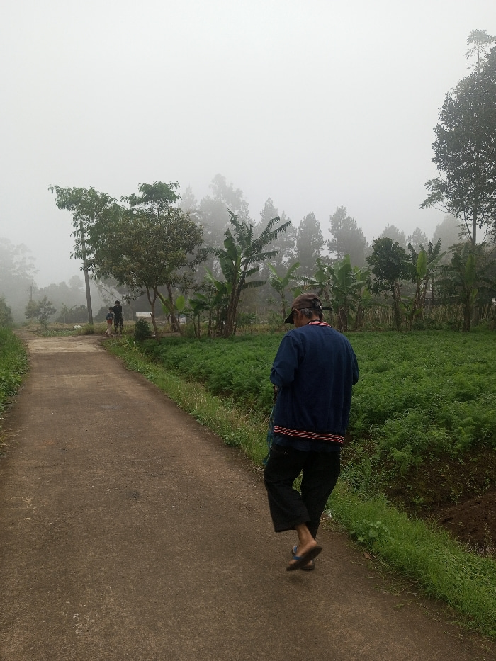 This image captures a rural landscape in Irupalai, Sri Lanka, on a day characterized by dense fog. A person, viewed from behind, is walking away from the camera on a narrow, dark grey paved path. This…read more