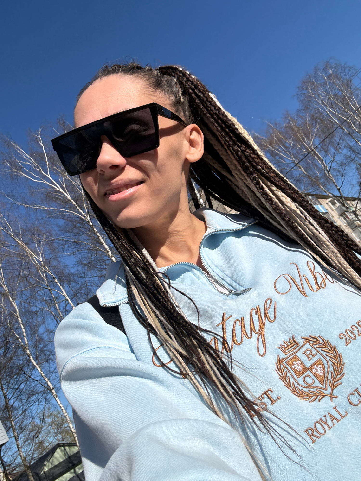 A smiling young person with long, multi-toned box braids (black, light brown, and blonde/white) is captured in an upward-angled close-up shot. They are wearing large, rectangular black sunglasses andβ¦read more