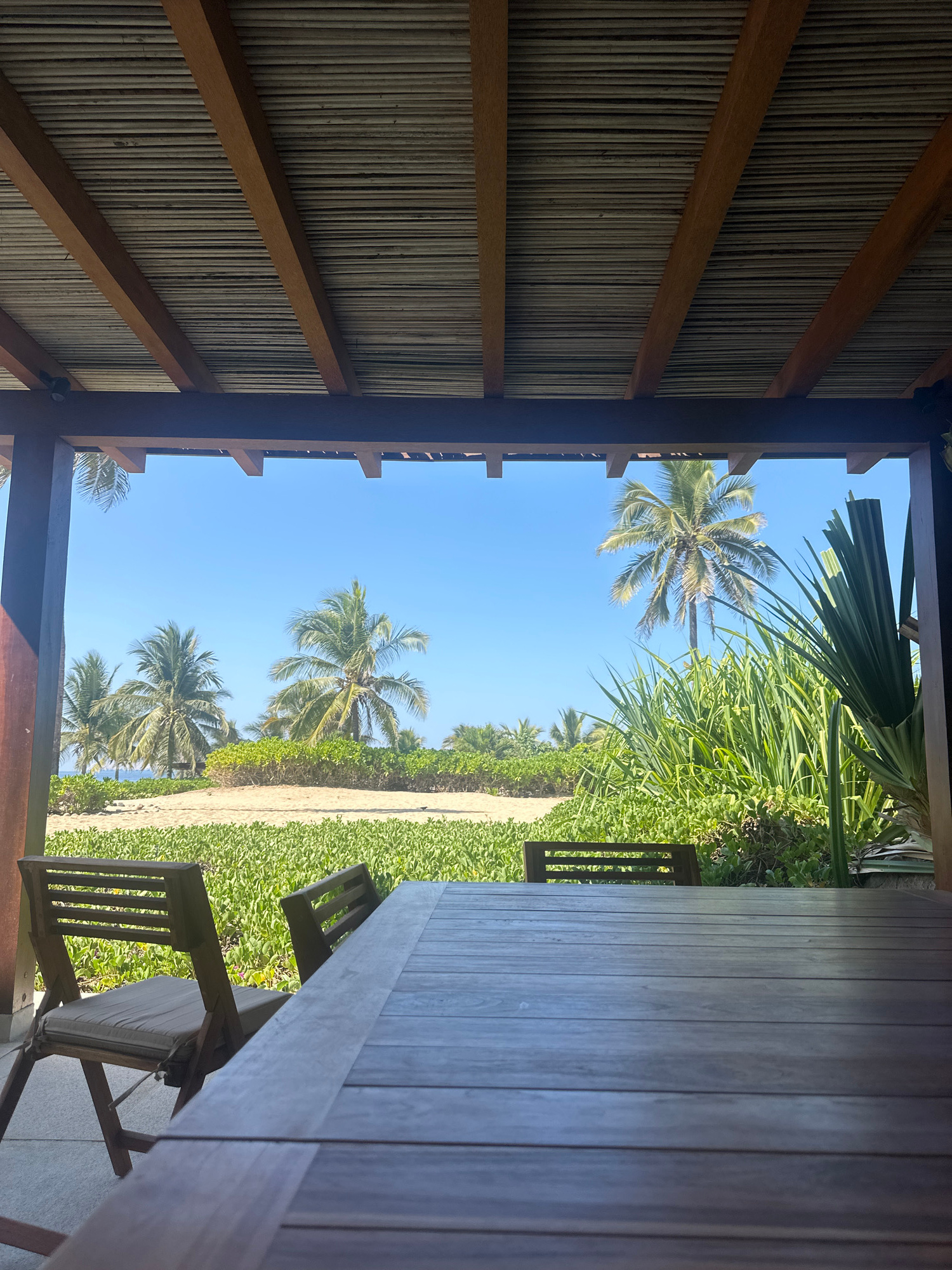 A static outdoor scene is captured from beneath a wooden pergola at Playa Blanca, Mexico. The pergola features dark wooden support beams and a ceiling constructed from light-colored, horizontal slats.…read more
