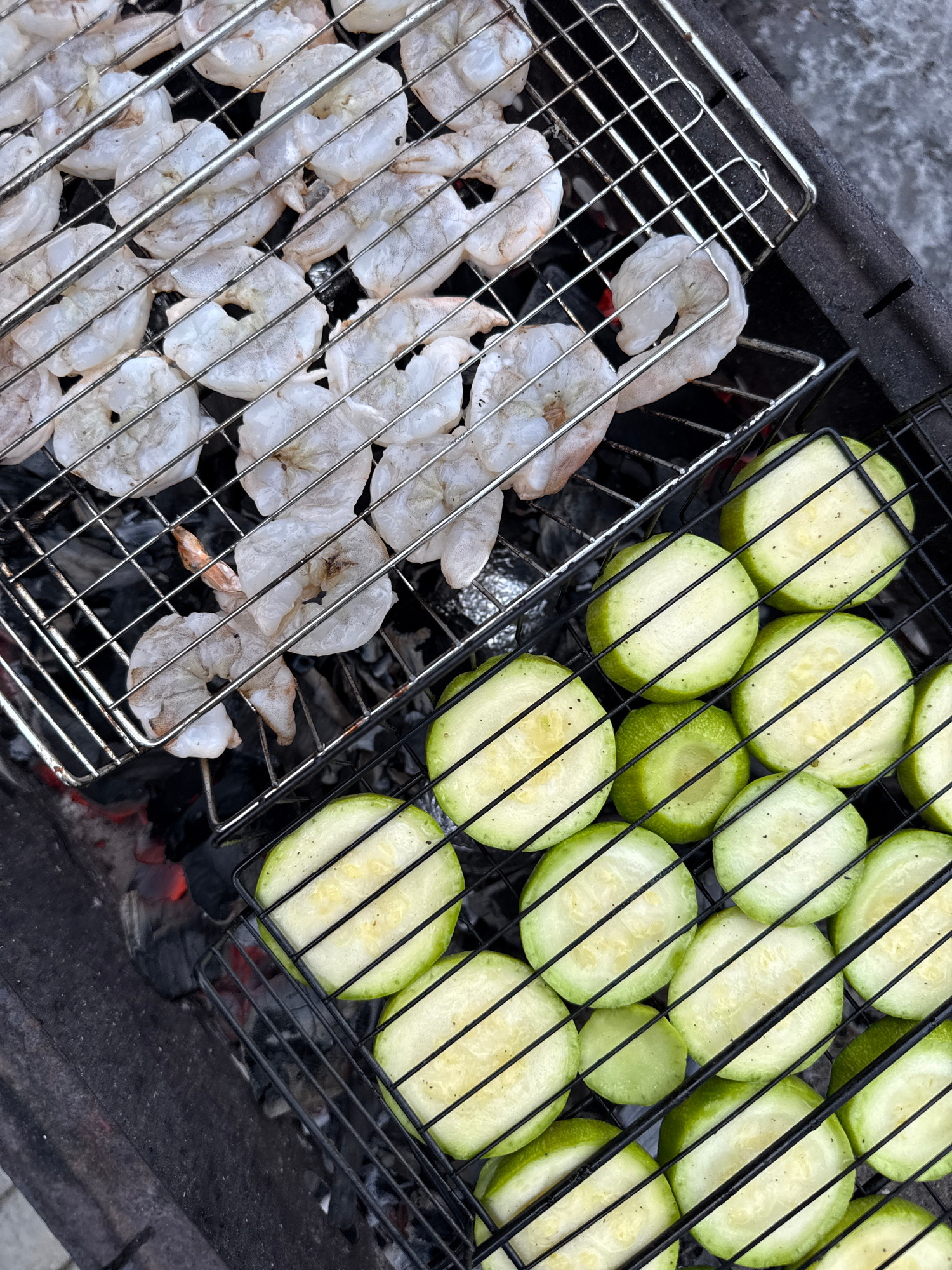 The image shows two grill baskets on top of a barbecue grill. One basket contains peeled shrimp, and the other contains sliced zucchini. The grill is situated outdoors and based on known information,…read more