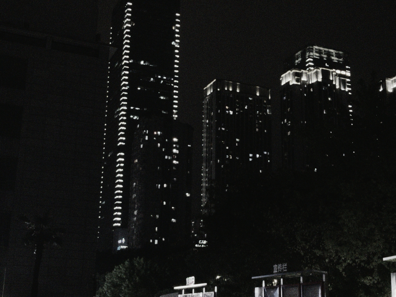 The photograph depicts a night scene in Yuzhong District, China, featuring a cluster of illuminated skyscrapers. The tallest building is distinguished by vertical rows of lights tracing its edges. Oth…read more