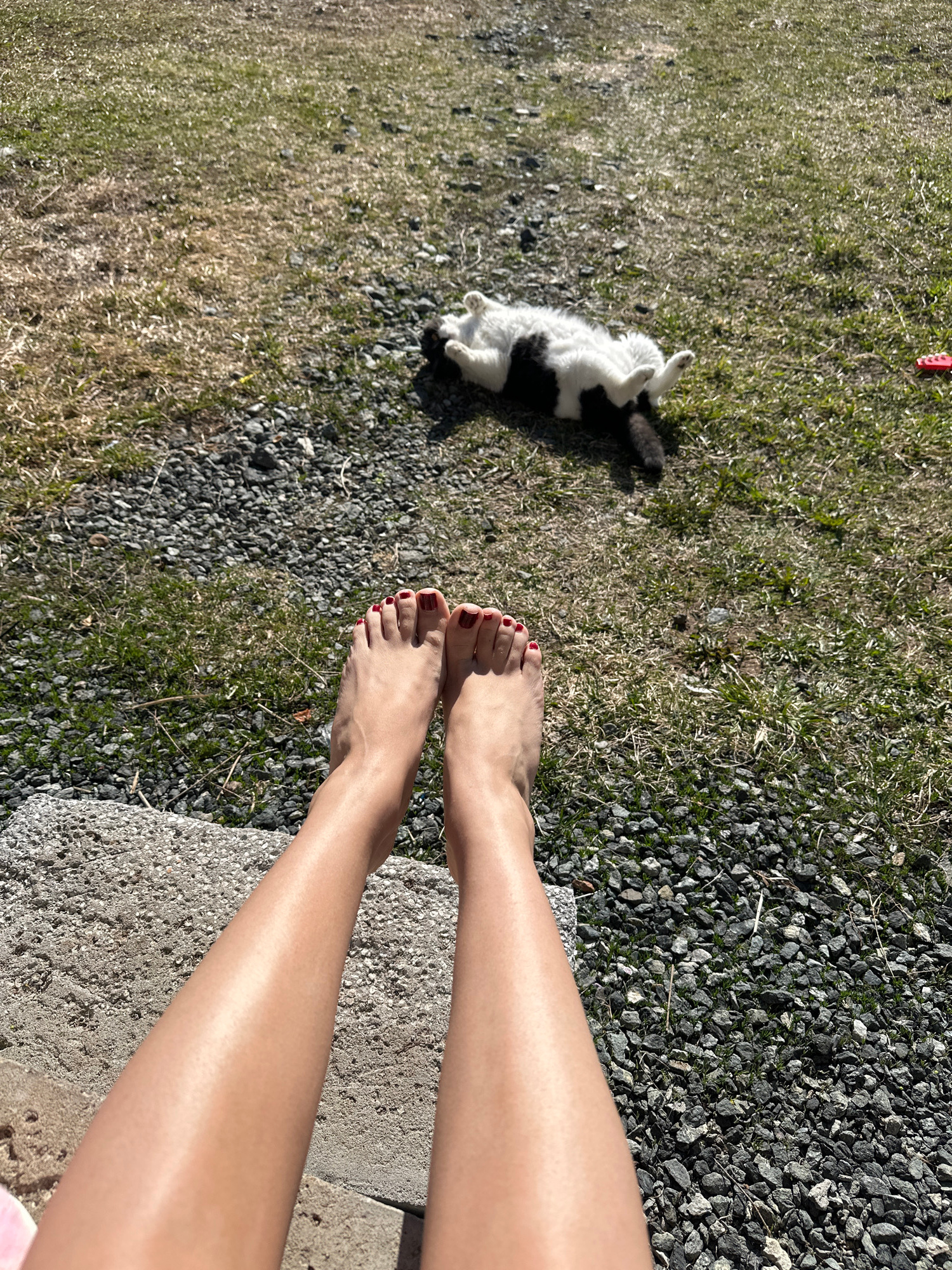 The image captures a bright outdoor scene in Kharnavy, Russia, featuring a person's legs and feet alongside a black and white cat. The person's bare feet, adorned with red nail polish, rest partially…read more