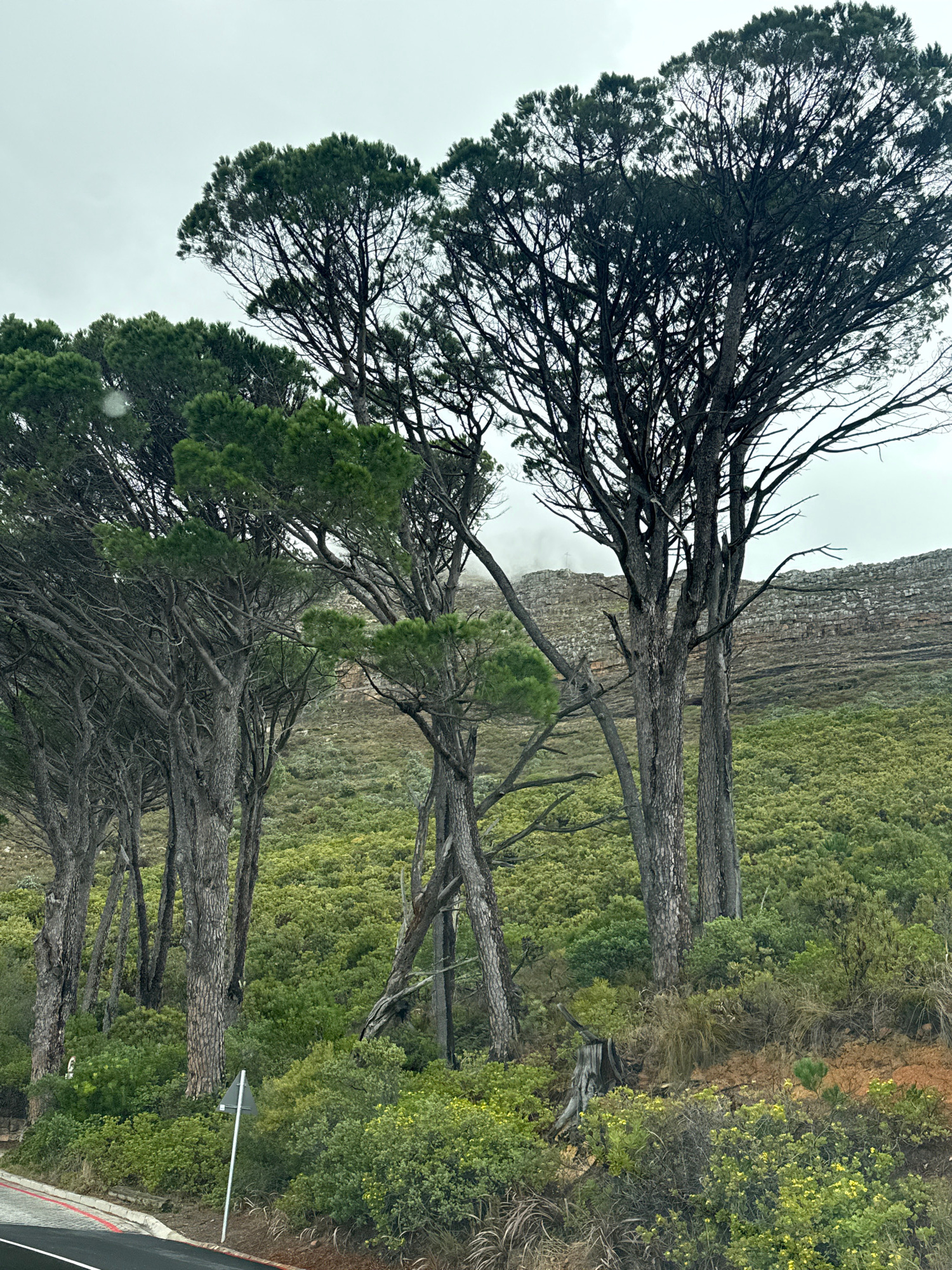 The image shows a row of trees along a road in what appears to be a mountainous area. The trees have sparse foliage, with many bare branches visible. The backdrop includes a cliff face and dense green…read more