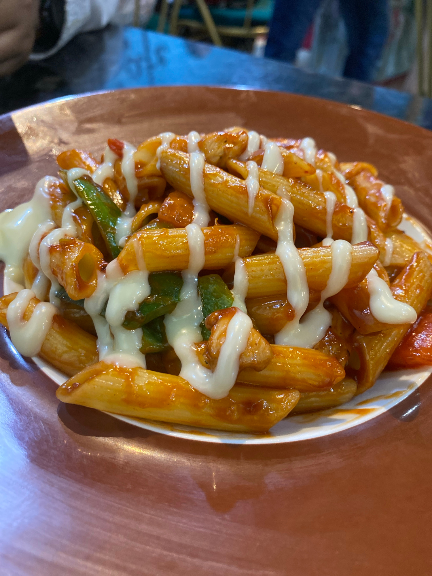 The image shows a close-up of a dish of penne pasta, topped with a red sauce, green peppers, and a white sauce. It is served in a white bowl on a brown surface. Based on available information, the loc…read more