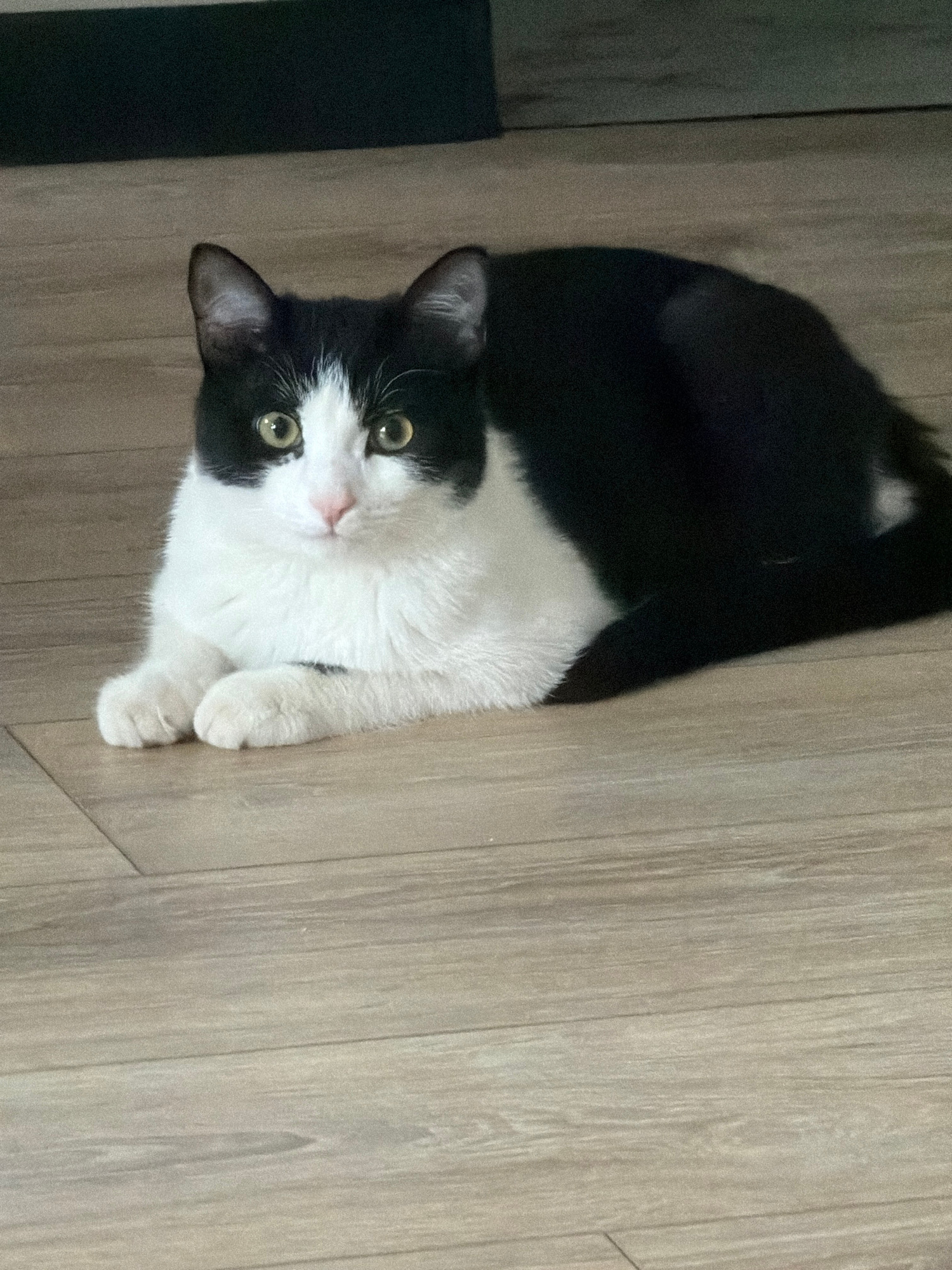 A black and white tuxedo cat is the central subject of the image, captured from a top-down perspective. The cat is lying on its left side on a light-colored wooden floor, possibly laminate, with its h…read more