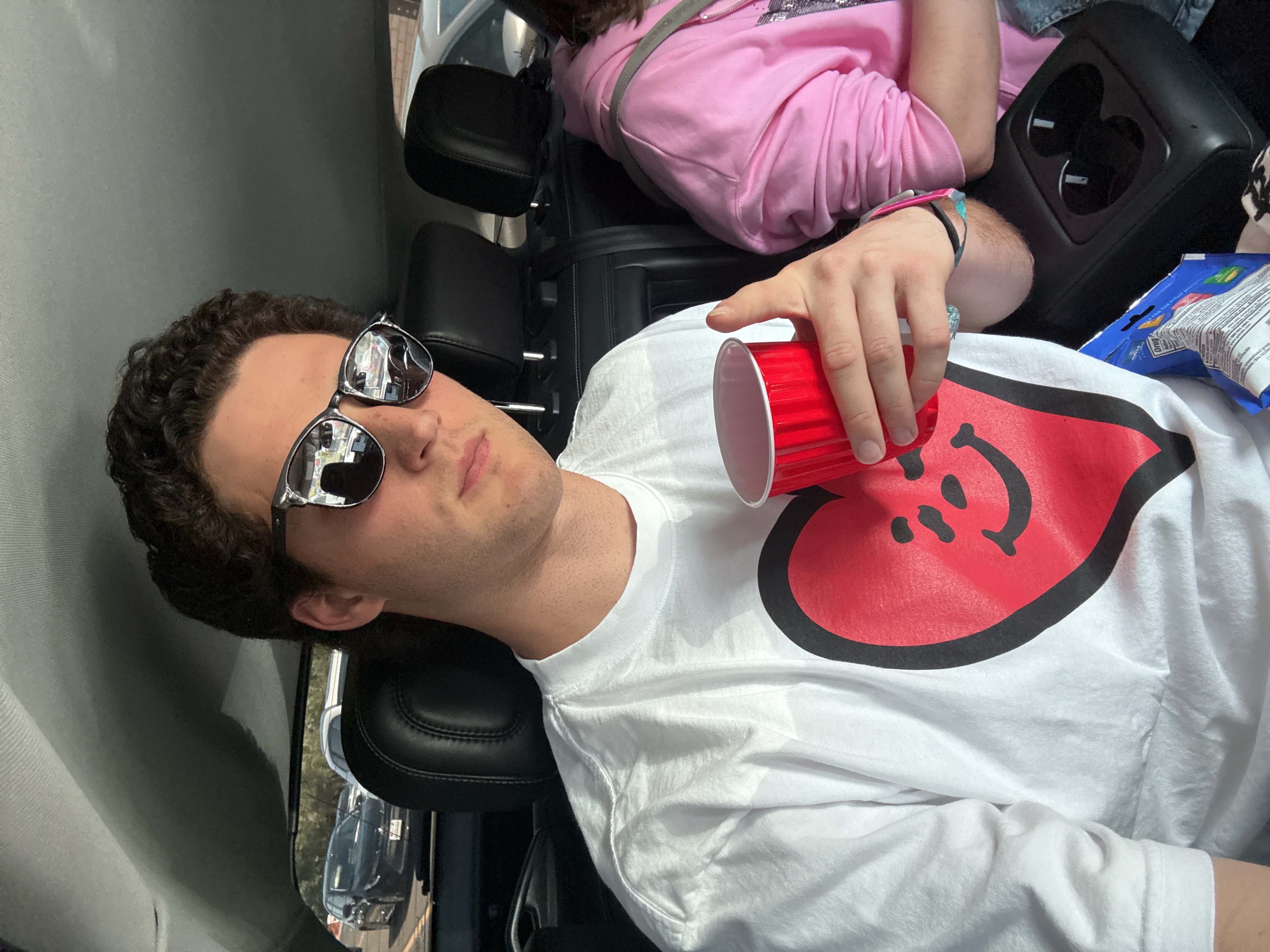 The image shows a Caucasian male in the front passenger seat of a car. He is wearing sunglasses and a white t-shirt with a red heart design and is holding a red plastic cup. A person wearing a pink sw…read more