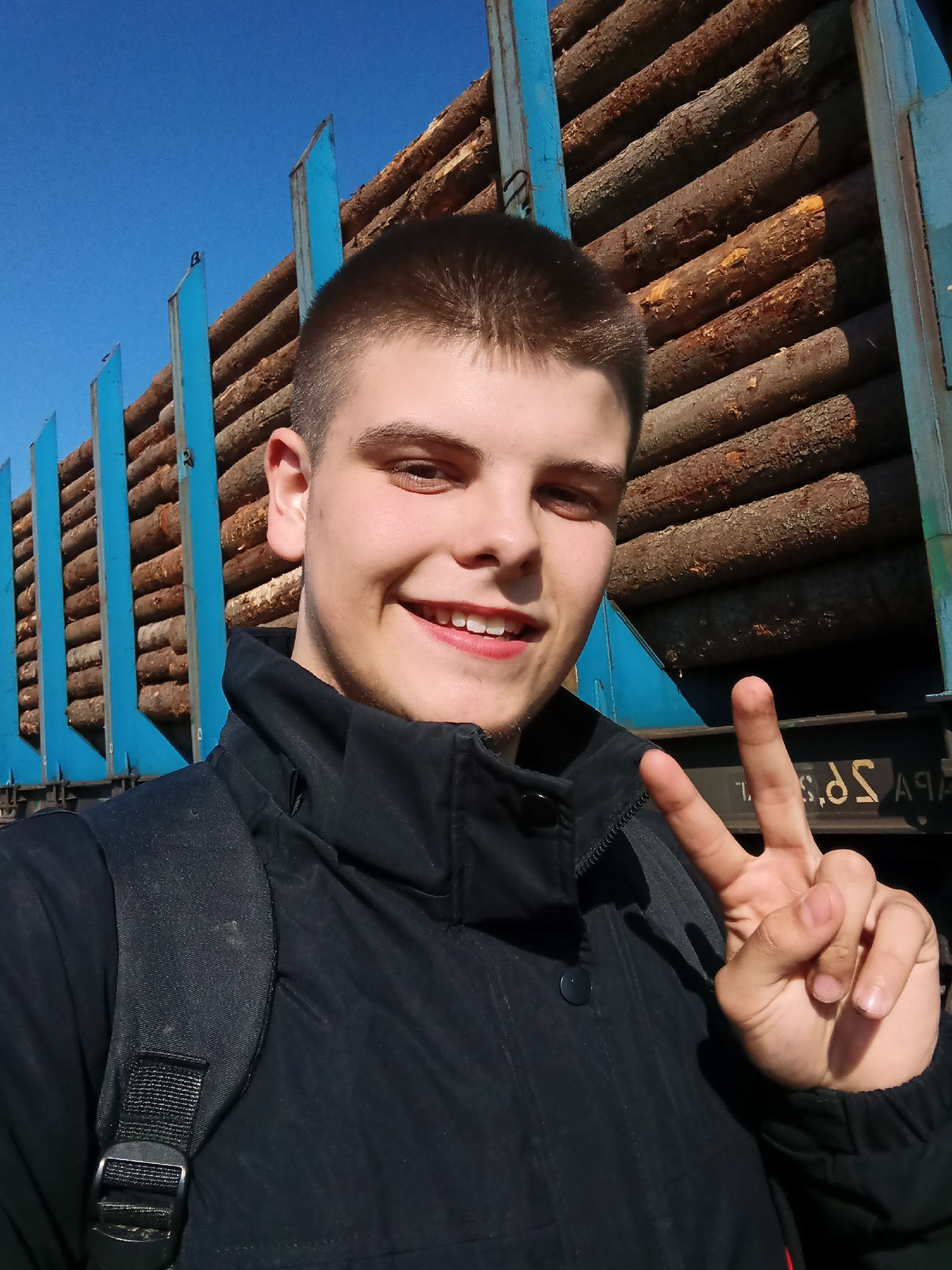 A young man poses for a selfie, flashing a peace sign. He stands in front of a train car loaded with logs. He wears a black jacket and has a backpack slung over one shoulder. The background features a…read more