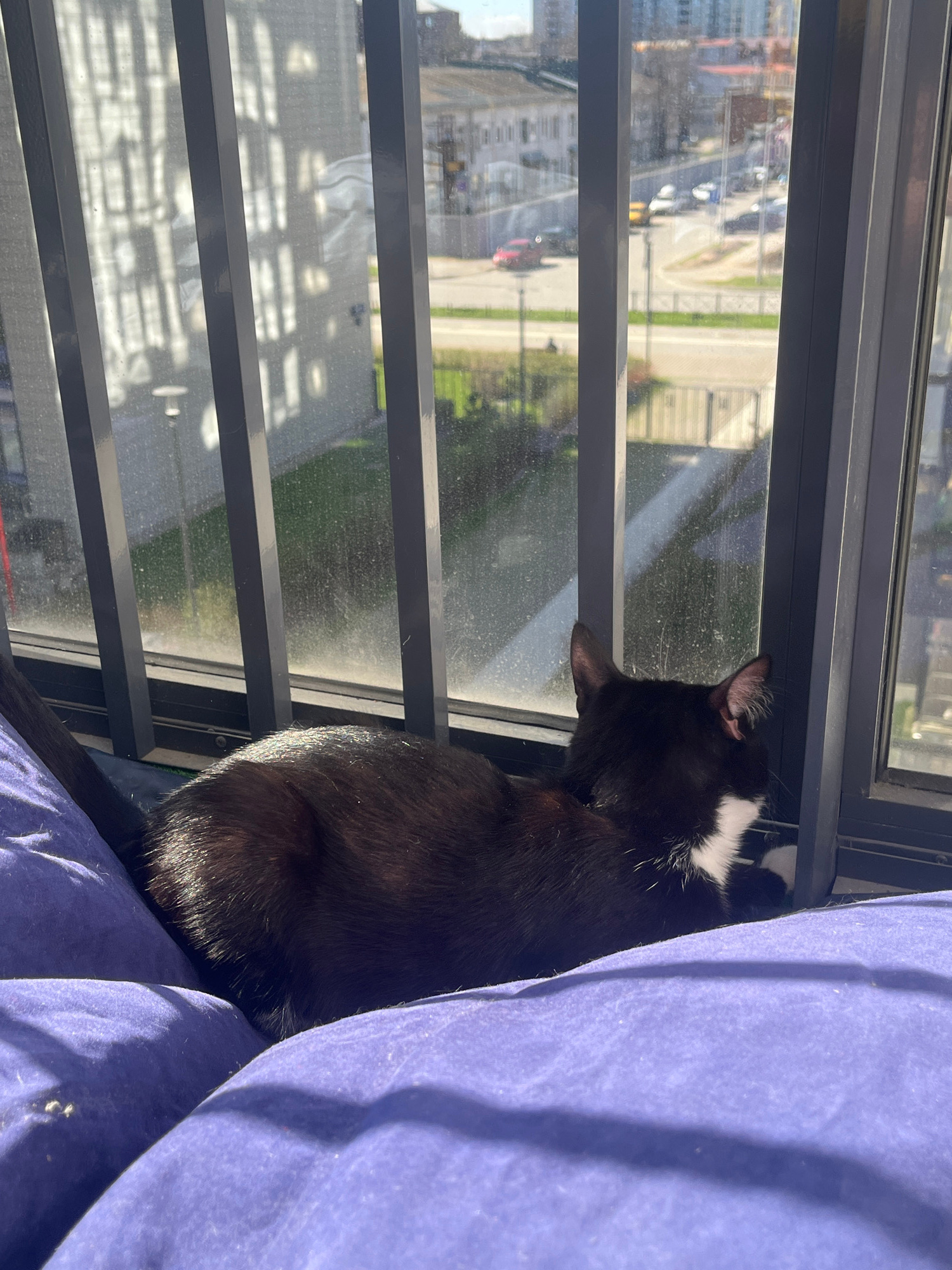 A black and white cat is perched on a blue cushion near a window, gazing out at a city street. The view through the window reveals a street scene in Saint Petersburg, Russia. The window has metal barsβ¦read more