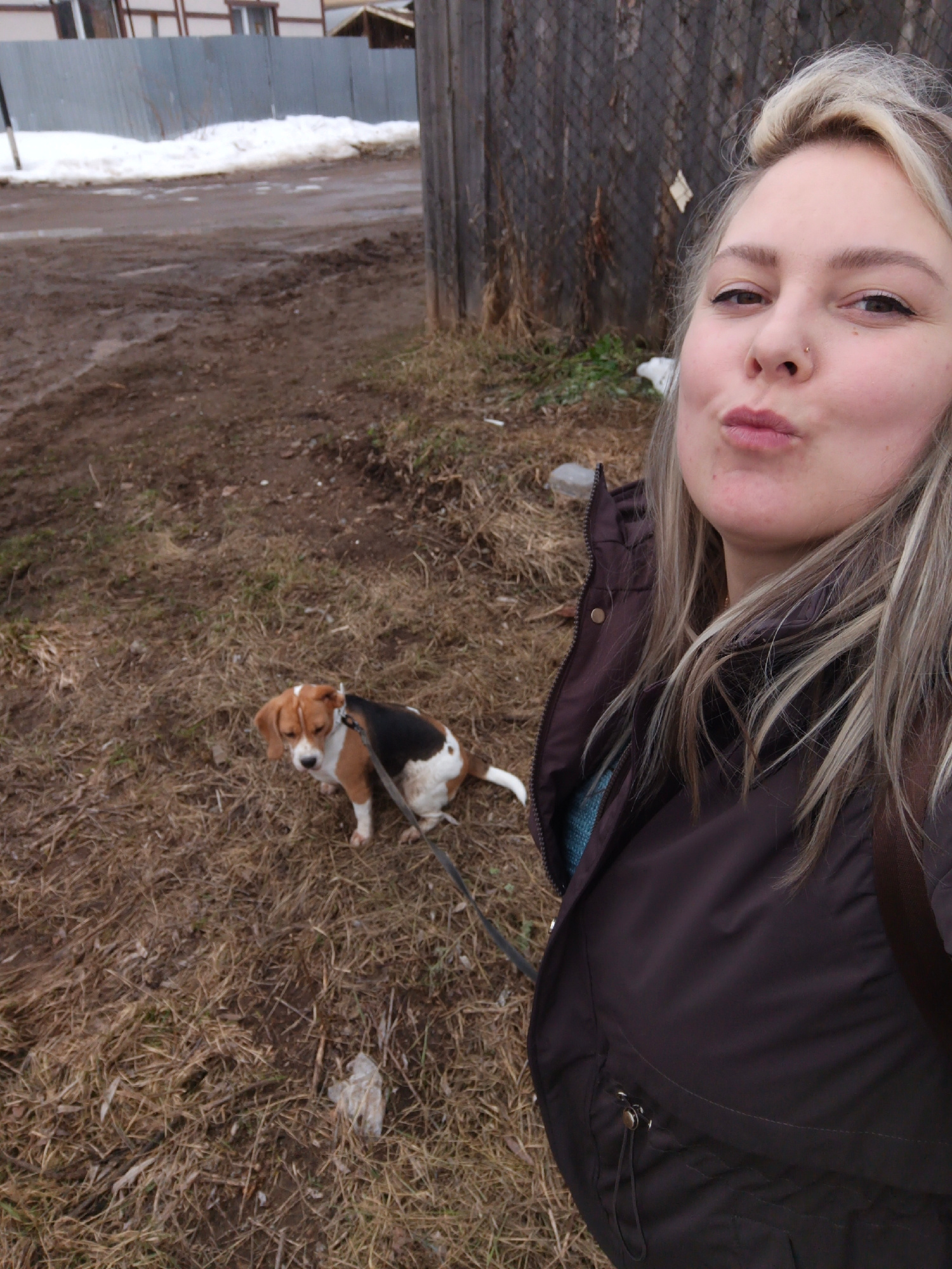 The image is a selfie taken outdoors in what appears to be a rural or suburban area. A woman with blonde hair and a nose ring is in the foreground, making a kissing face towards the camera. She is wea…read more