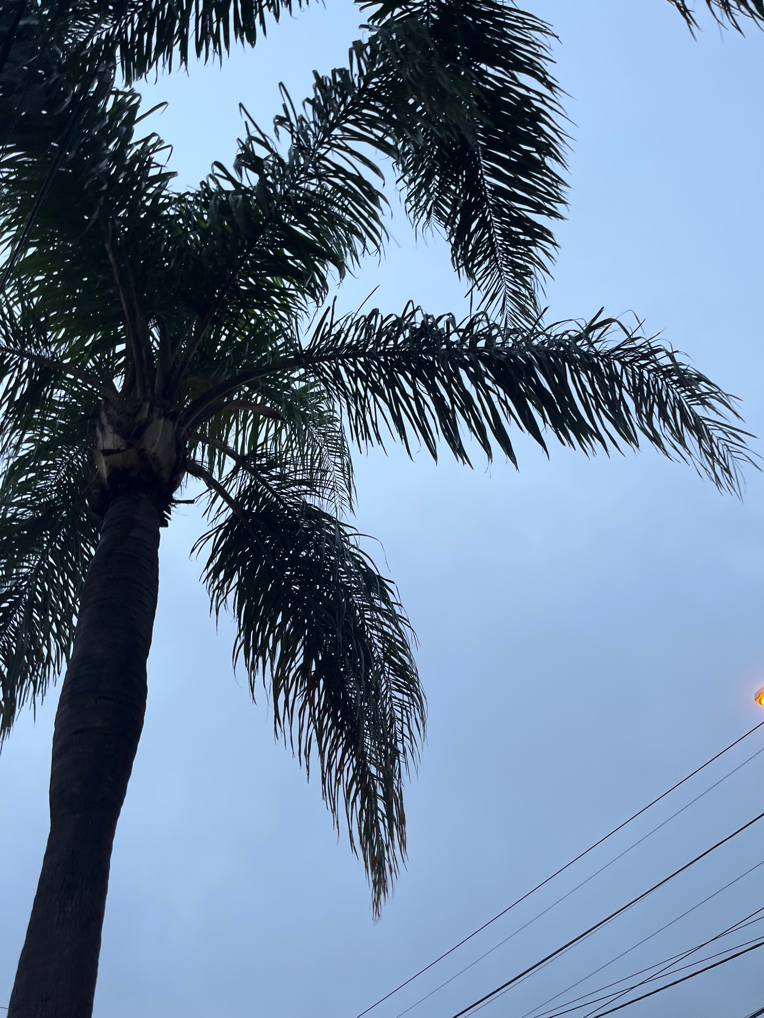 An upward angle shot of palm tree fronds against a light blue sky, with a few electrical wires visible in the upper right. A bright, out-of-focus light source is visible in the top right corner. The l…read more