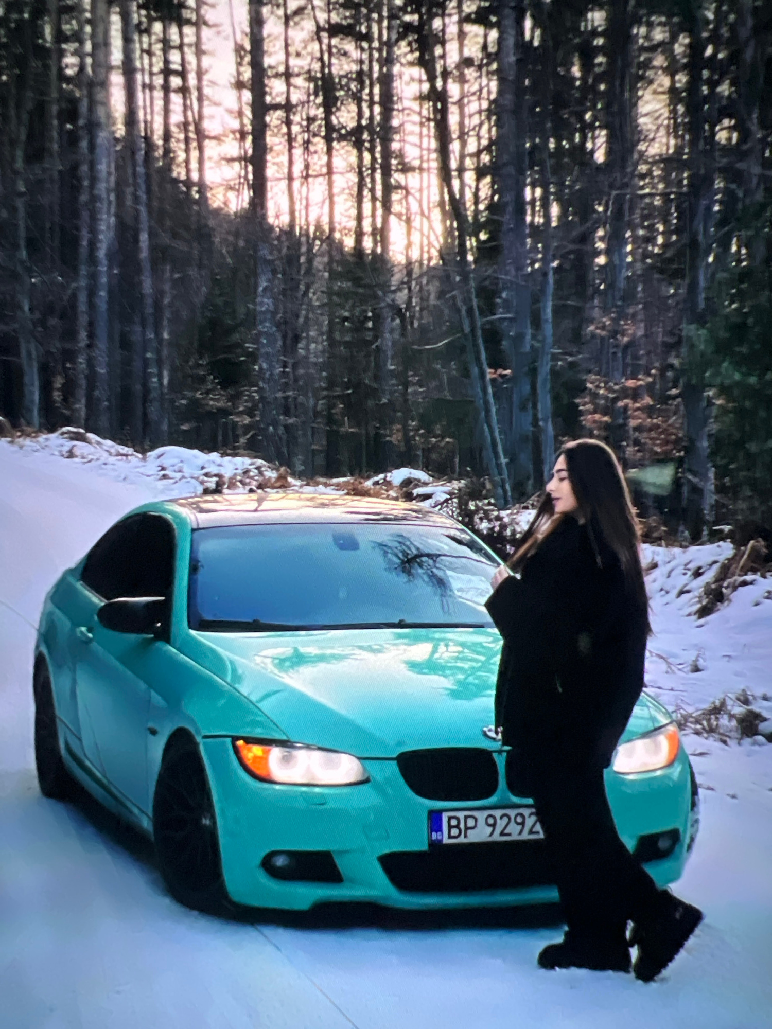 The image, when properly oriented, shows a woman posing next to a light blue or teal-colored car in a snowy, forested landscape in Markovo, Bulgaria. The woman, with long dark hair, is wearing a dark…read more