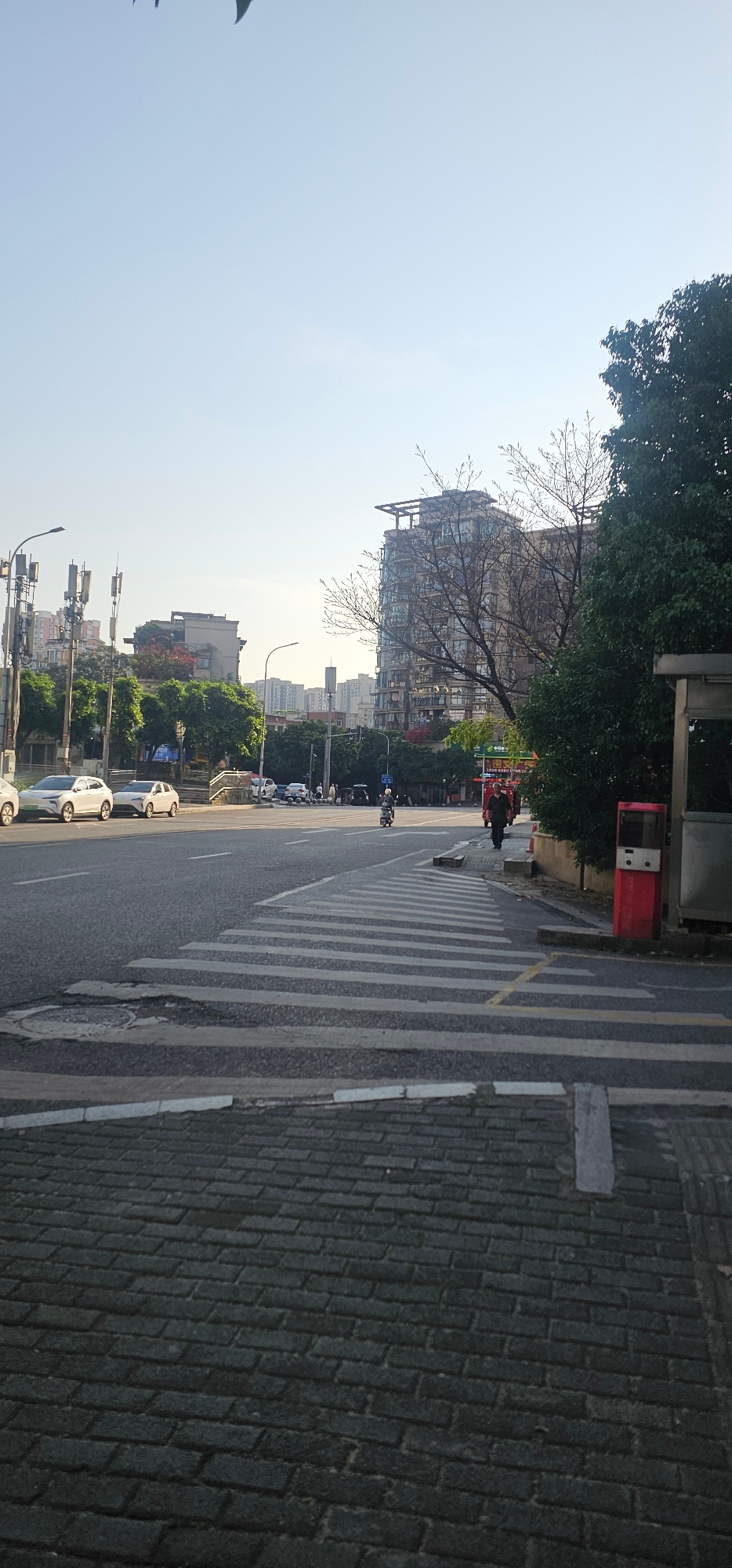 The image depicts a street scene in Jiulongpo District, China. The street is lined with buildings of varying heights, and trees are visible along the sidewalks. A crosswalk with white stripes is promi…read more