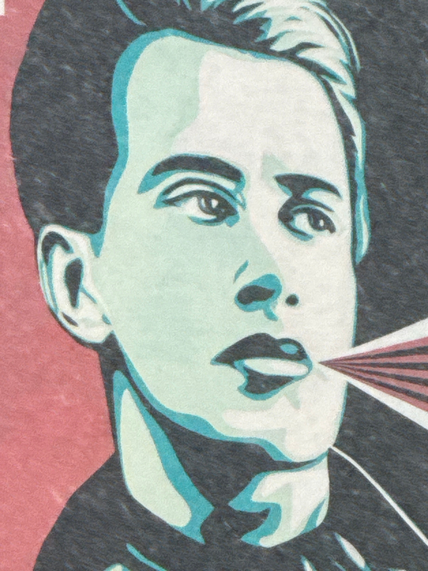 The image depicts a close-up of a person's face, rendered in a graphic style with defined outlines and limited color palette. The face is positioned at an upward angle, suggesting the person is lookin…read more