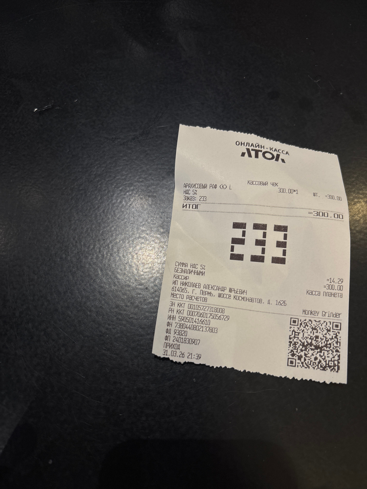 The image shows a receipt from the Monkey Grinder cafe, located at 1625, Kosmonavtov Highway, Perm, Russia. The receipt indicates a purchase of "Peanut Raf (K) L", with a total cost of 300.00. The rec…read more