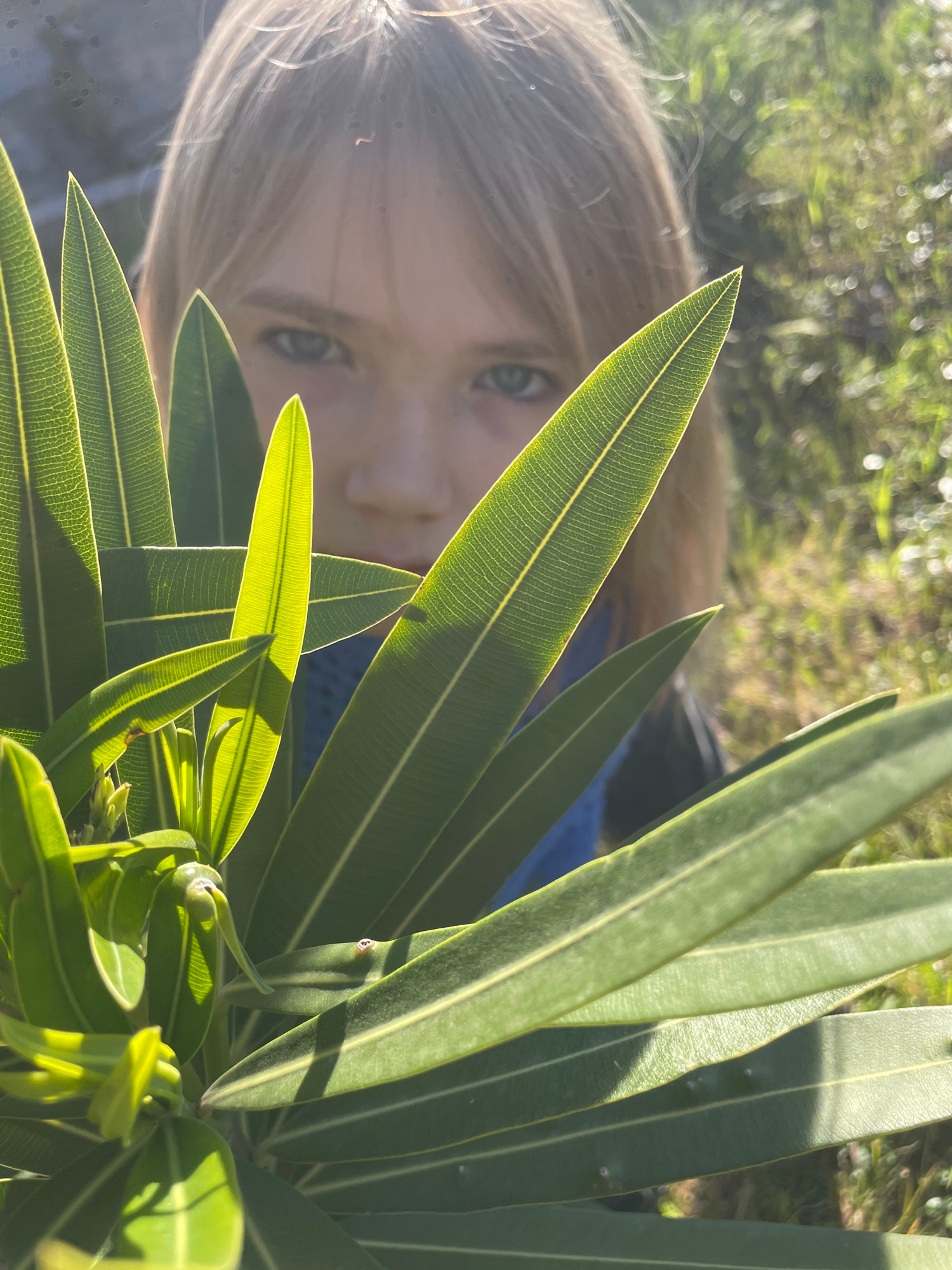 A close-up shot features green, linear leaves with parallel veins in the foreground. Behind the leaves, slightly blurred, is a fair-skinned person with blonde hair. The background is an indistinct are…read more