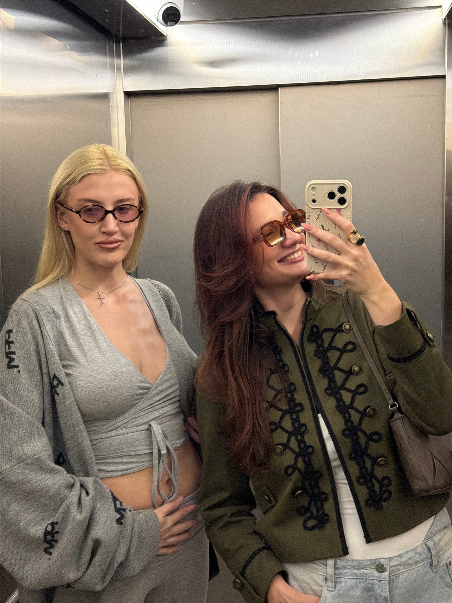Two young women pose for a selfie in what appears to be an elevator. The woman taking the photo has brown hair, sunglasses, and is wearing a green jacket with decorative black trim. The other woman ha…read more