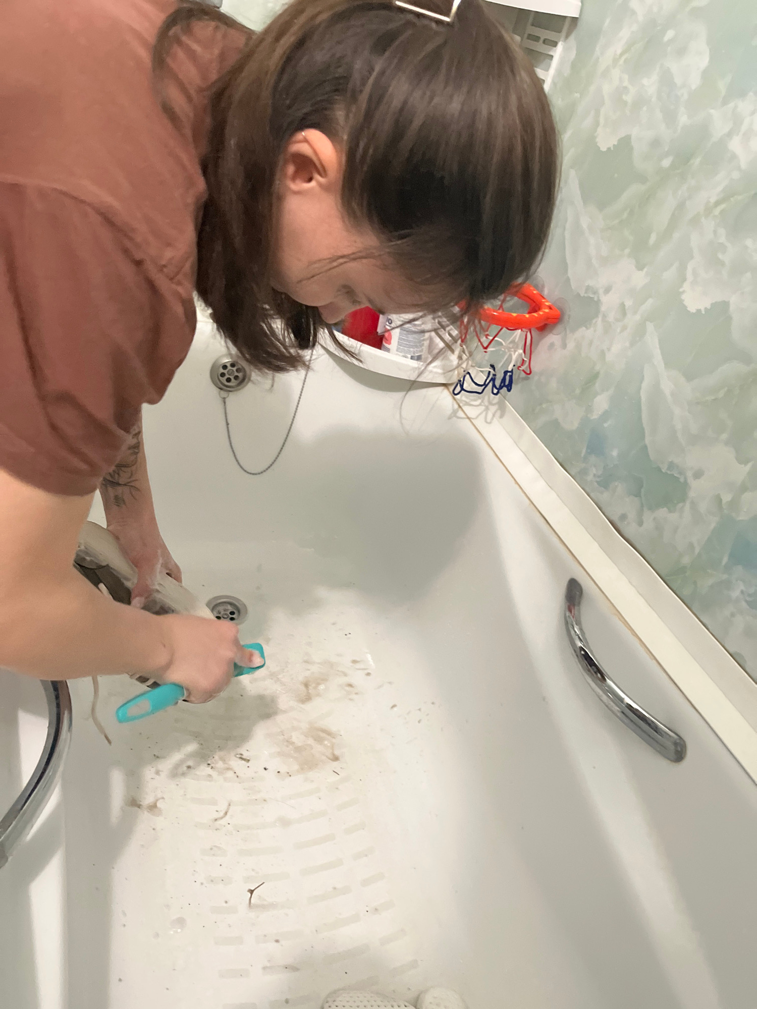 A woman is cleaning a white bathtub. The bathtub has a silver grab bar and a chrome faucet. There is debris in the bathtub, including hair and dirt. The woman is holding a spray bottle in her right ha…read more